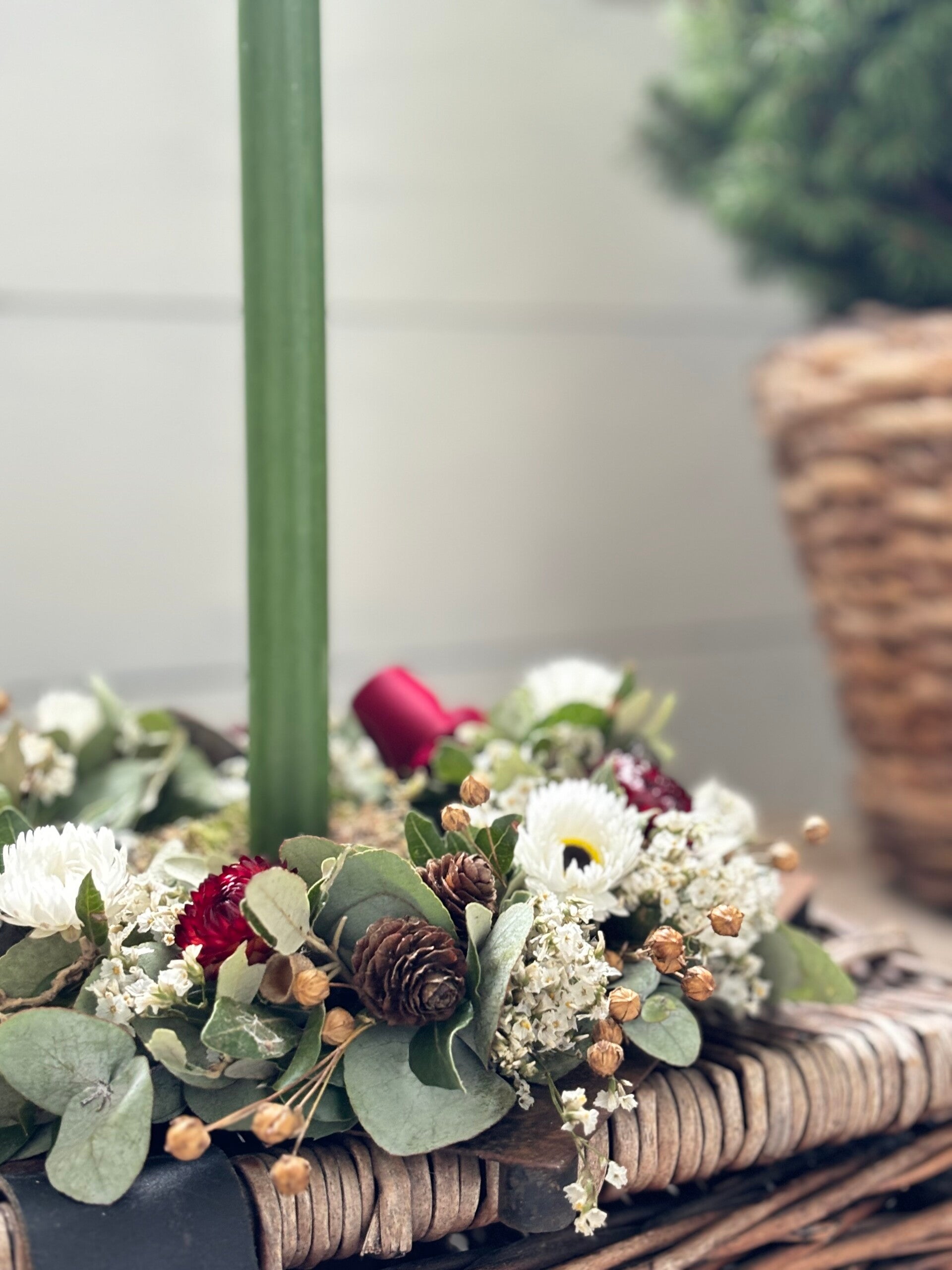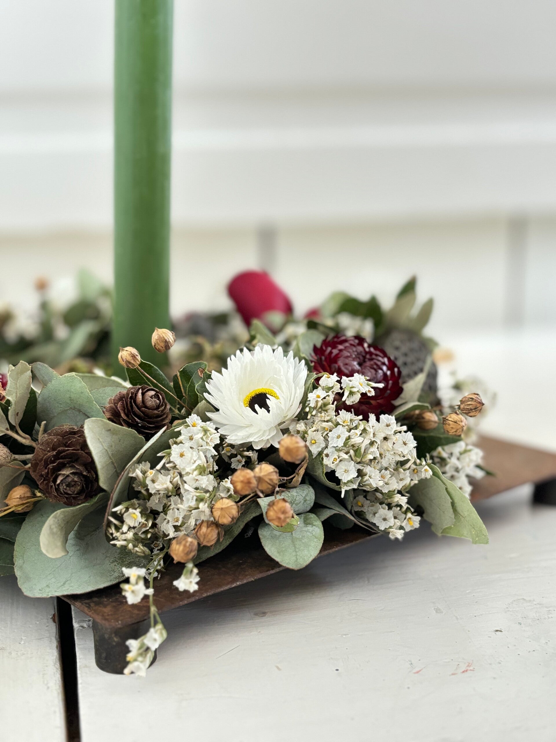 Dit super leuke kransje is gemaakt op plateautje met kaarsenhouder. Het blad en de bloemen zijn mooi ingedroogd.