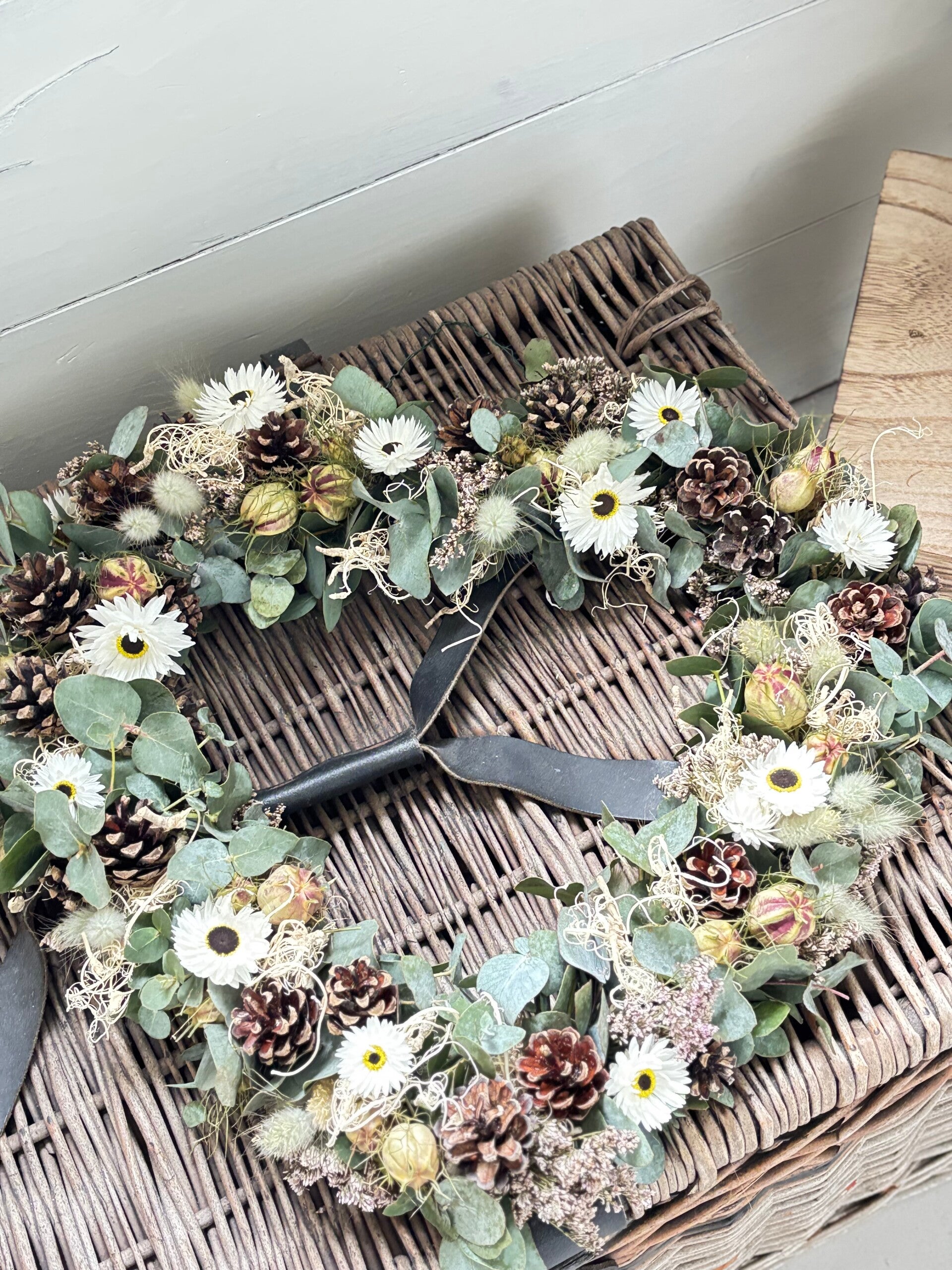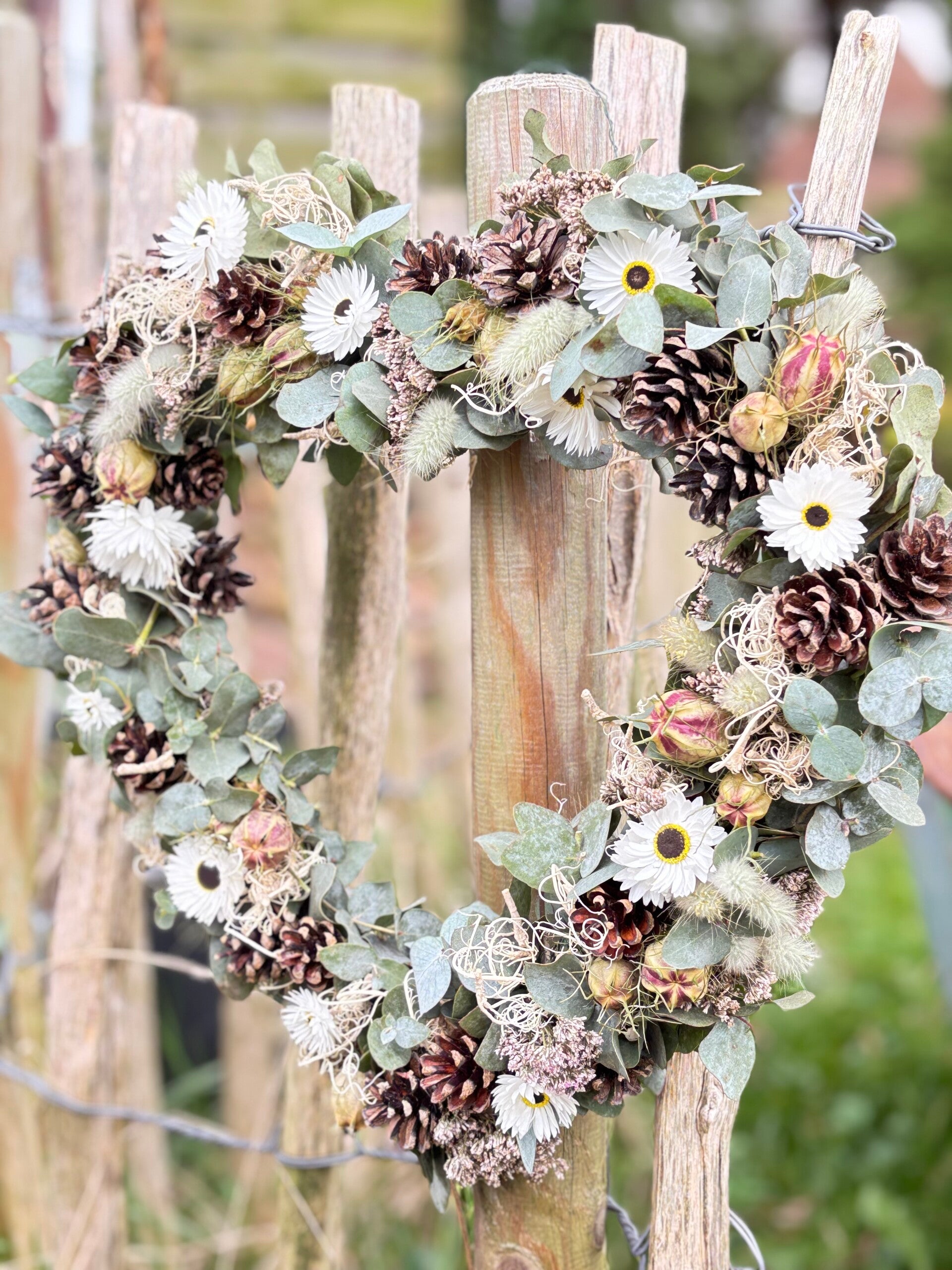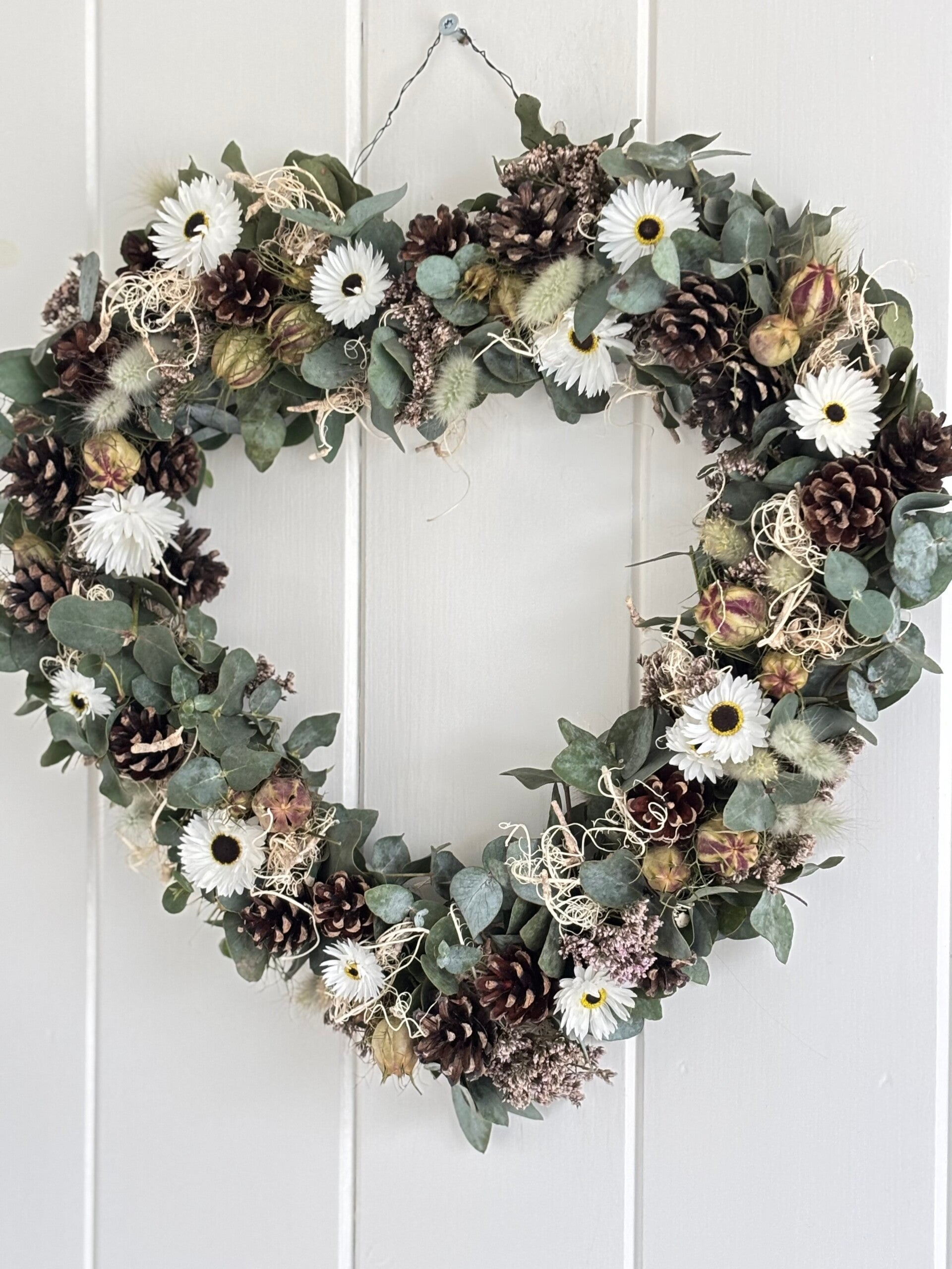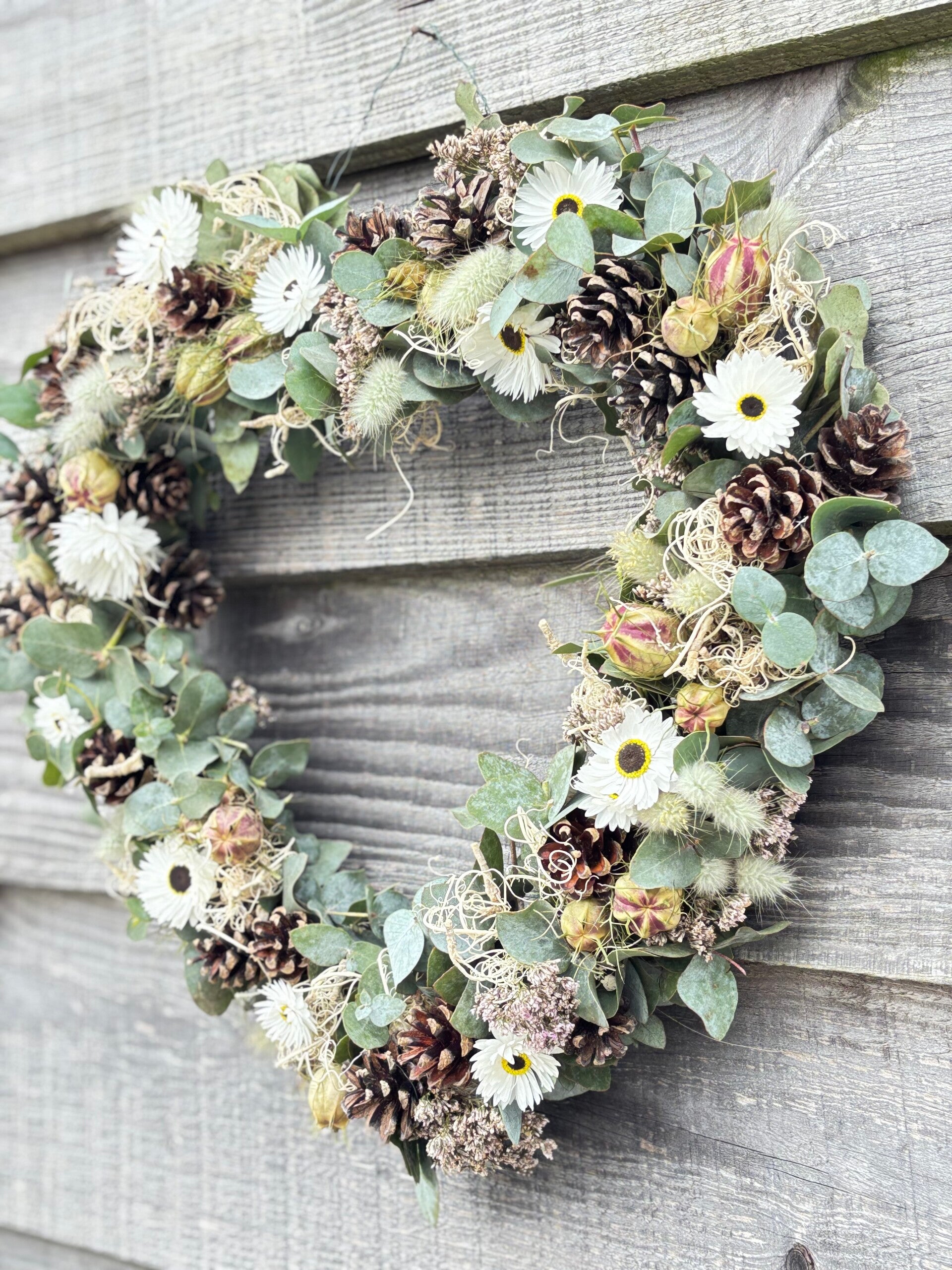 Wij worden heel vrolijk van dit lieve hartje. Gemaakt van kleine dennenappeltjes, eucalyptus en onze eigen gekweekte droogbloemen. Met liefde gemaakt.