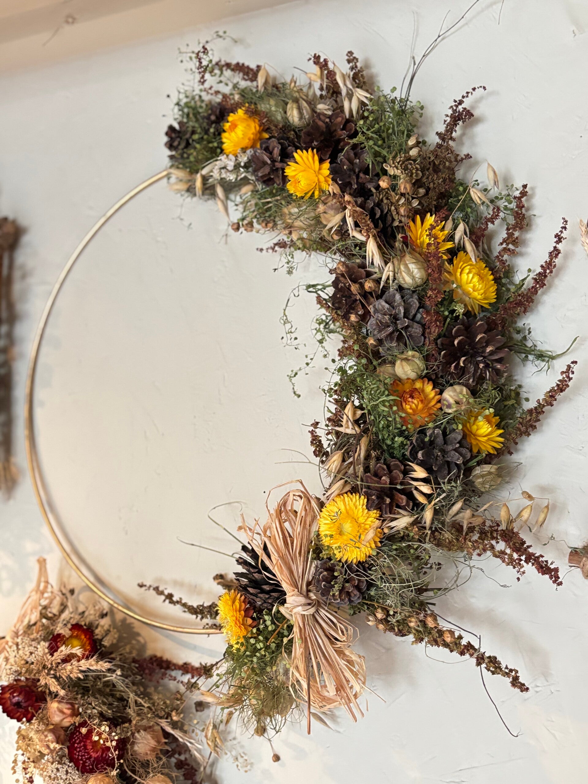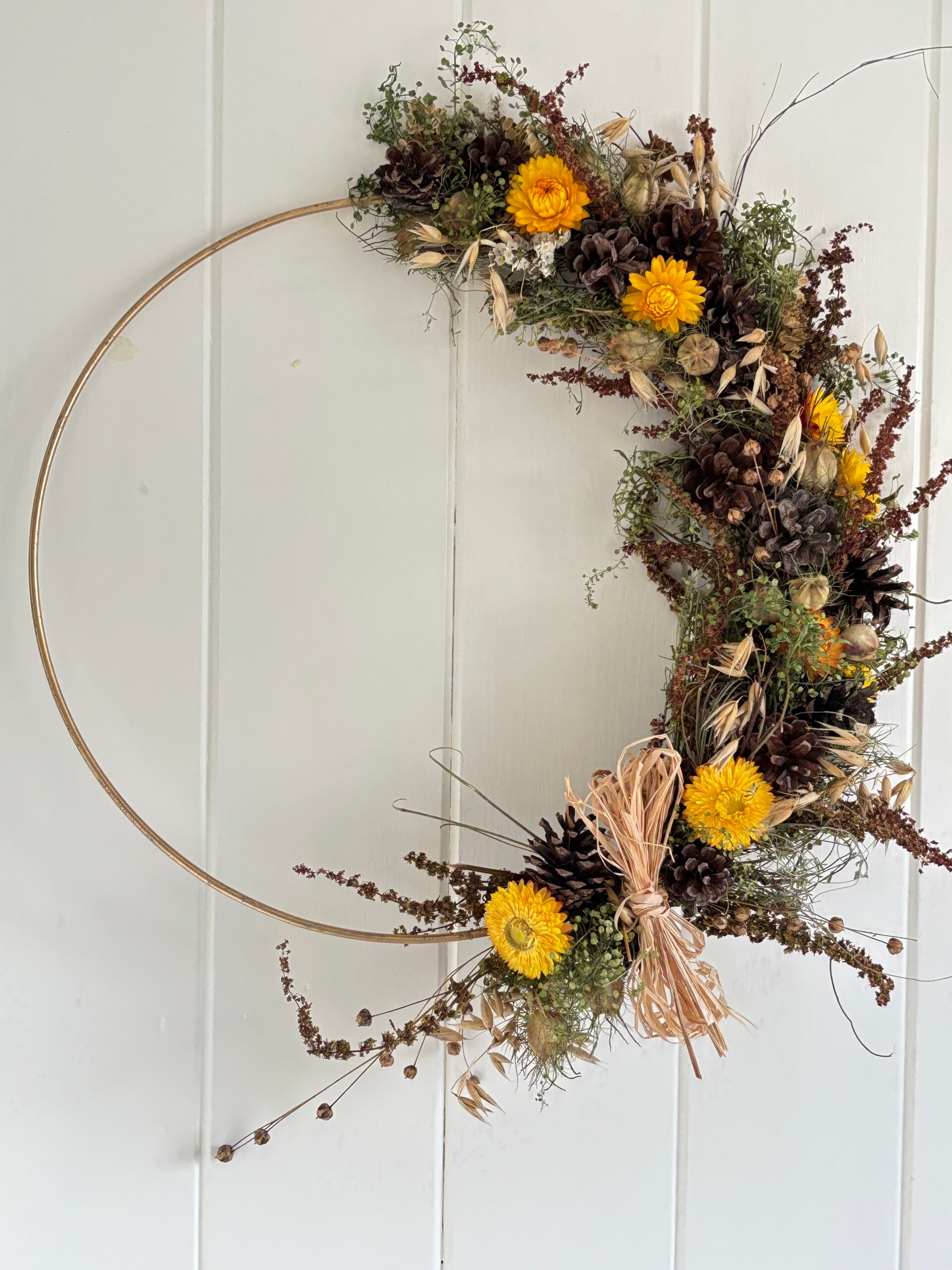 Droogbloemen krans op goudkleurig ring