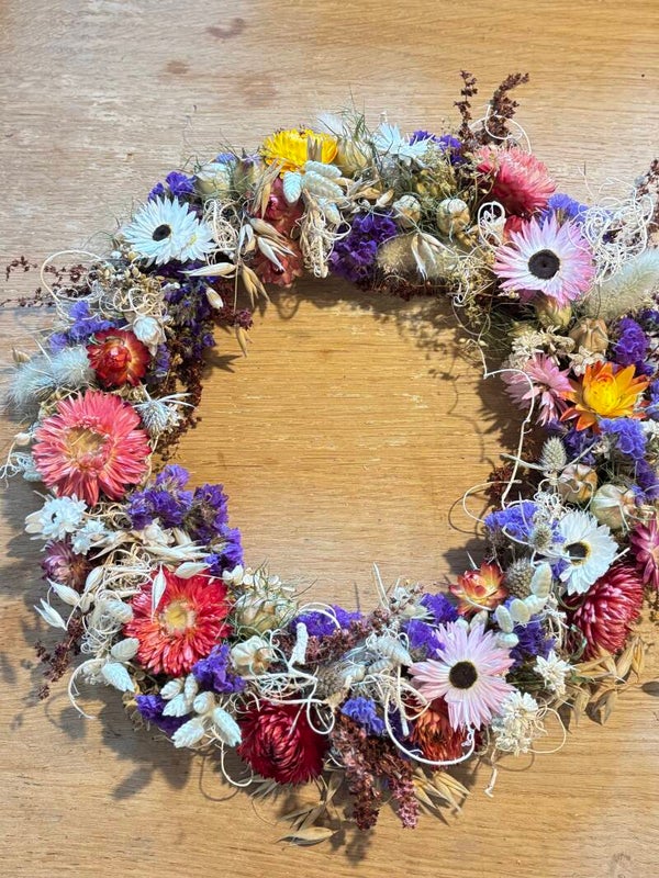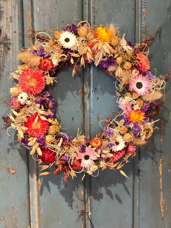 Hang het kransje niet in de volle zon. De kleuren blijven zo lang mooi.