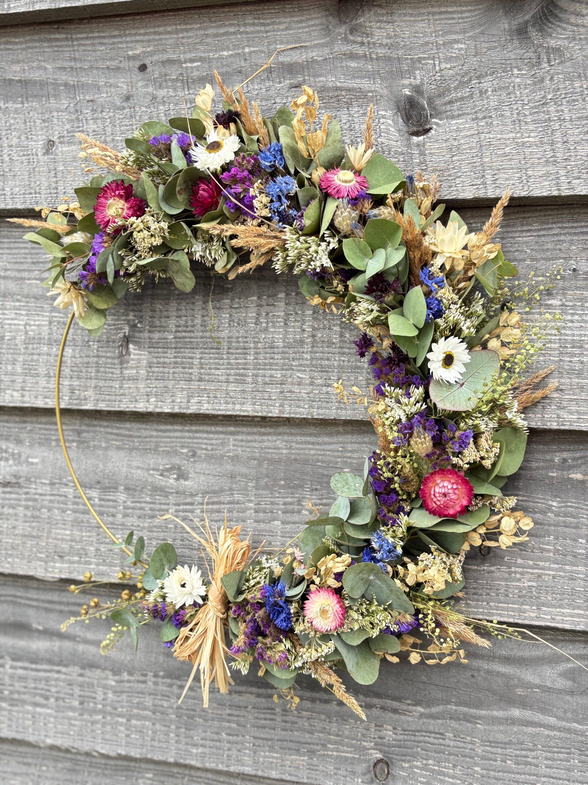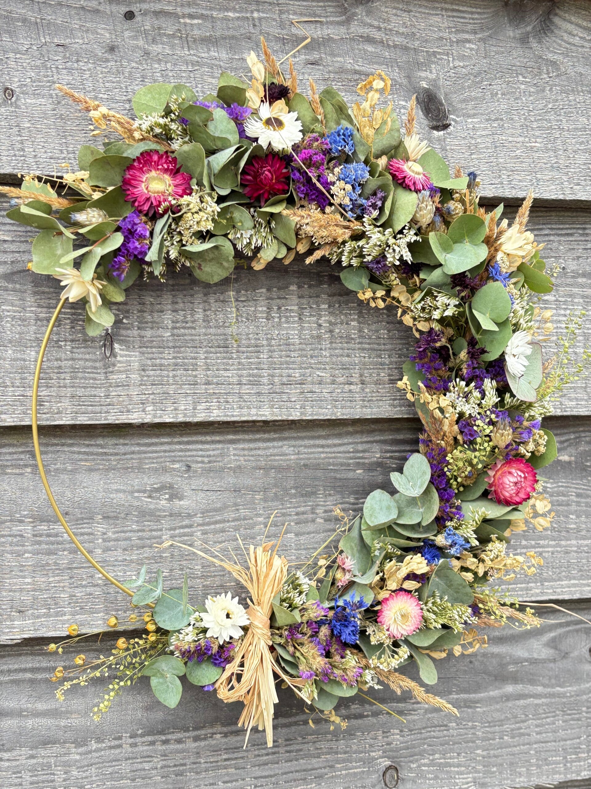 Deze goudkleurige ring is gevuld met prachtige droogbloemen uit onze eigen tuin. Duurzaam, kleurrijk en eenvoudig sierlijk.