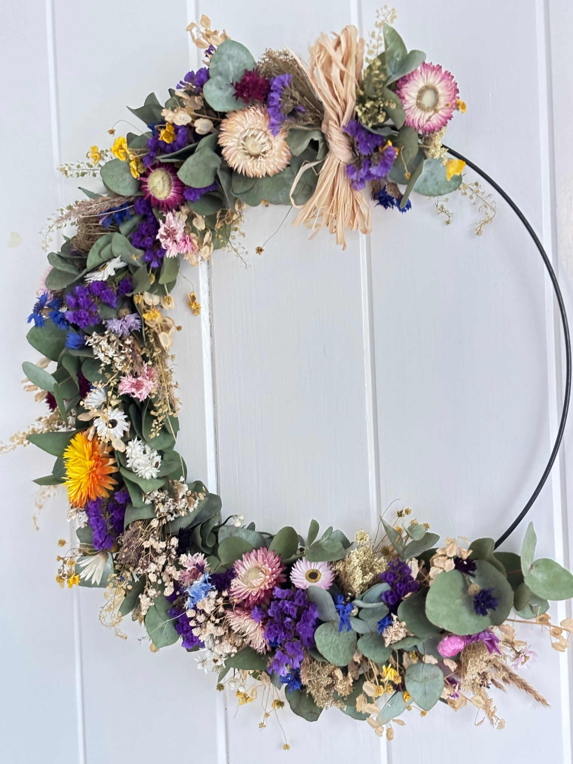 Heerlijk geurende eucalyptus met onze eigen gekweekte droogbloemen maken van deze krans een eenvoudig, sierlijk decoratie voor aan de muur.