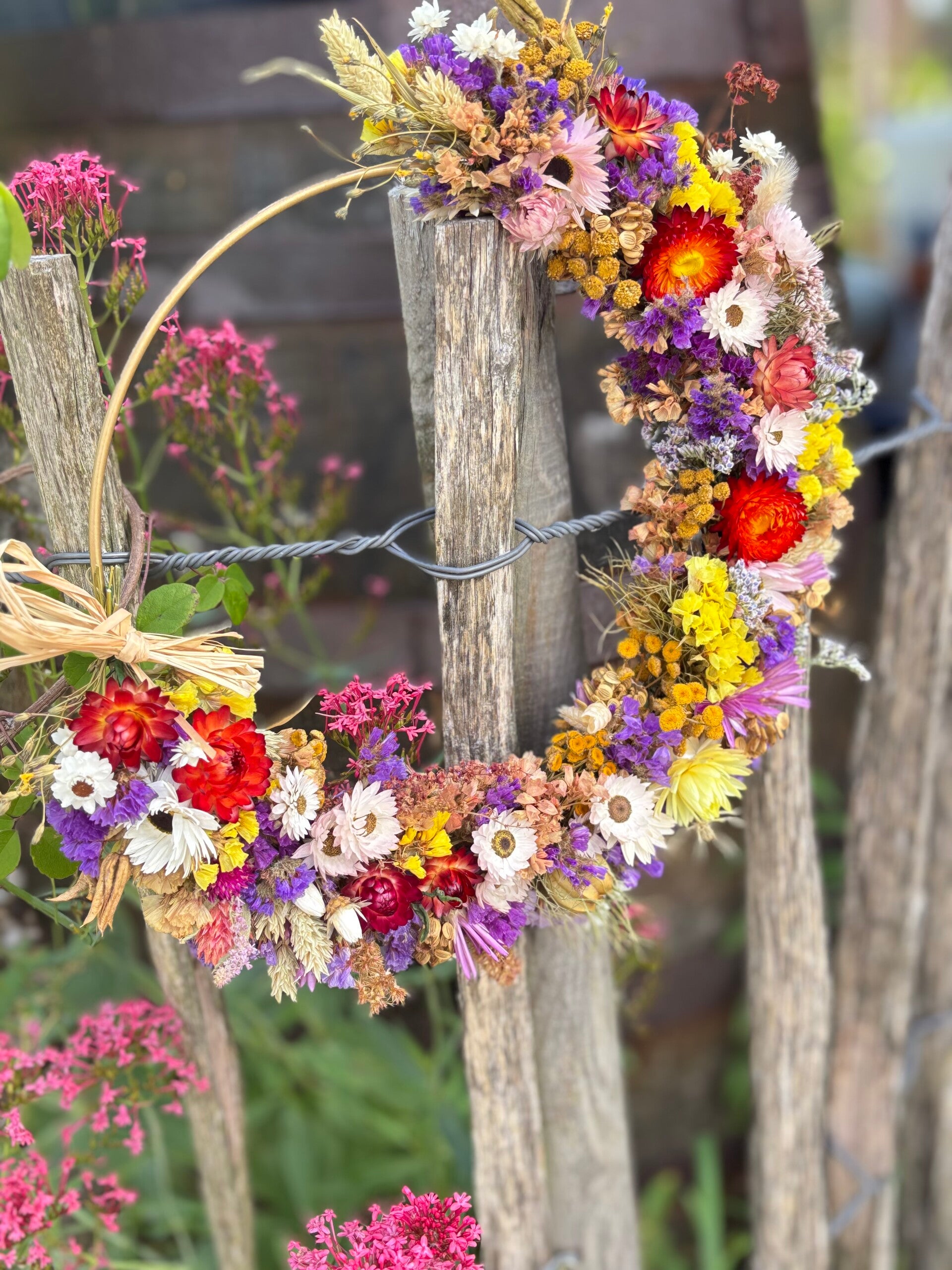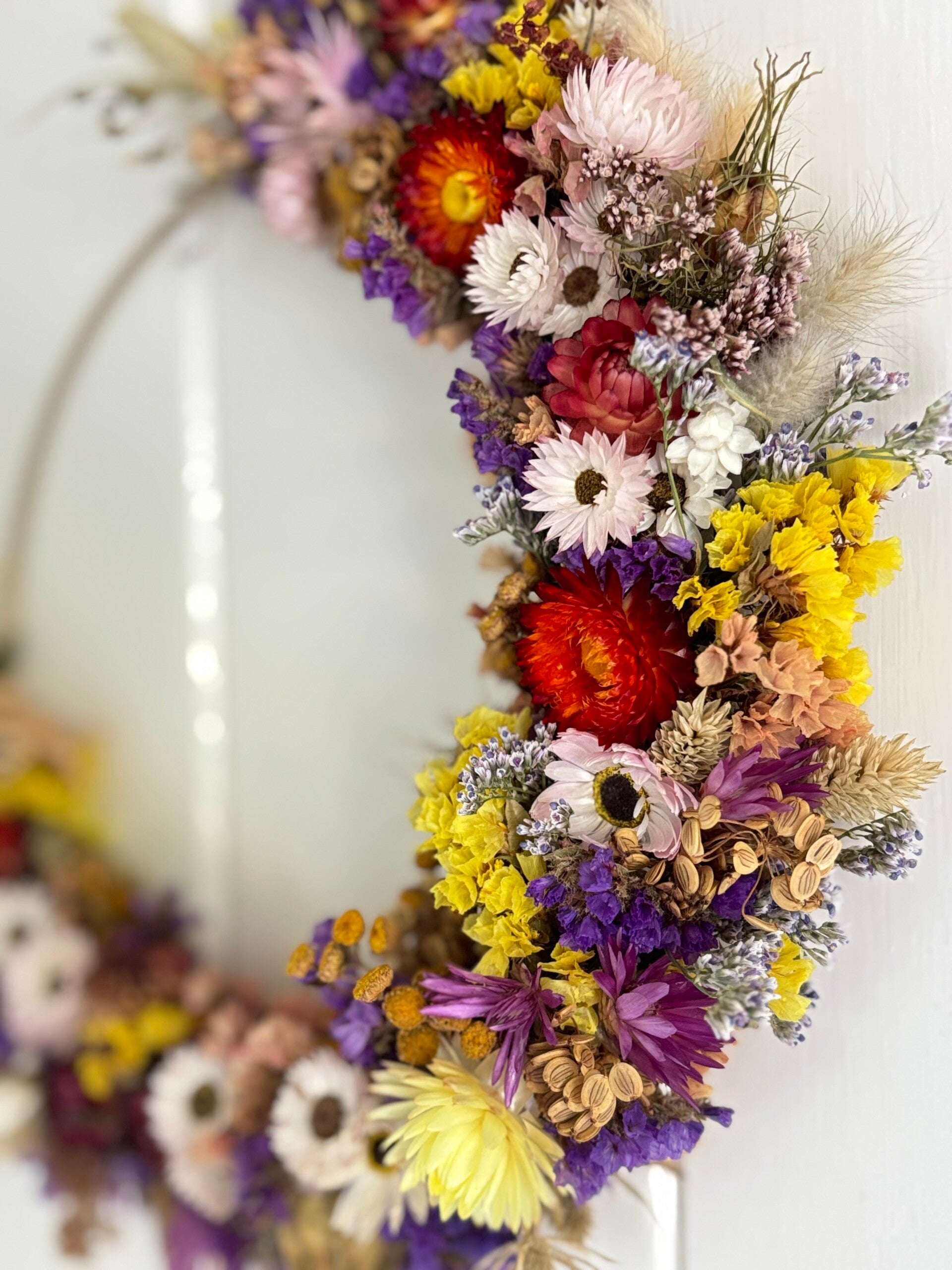 Iedere krans is hand gebonden met onze eigen gekweekte, duurzame, gifvrije droogbloemen en uniek.