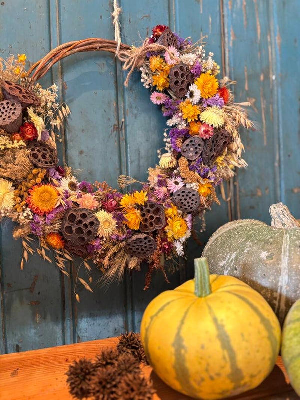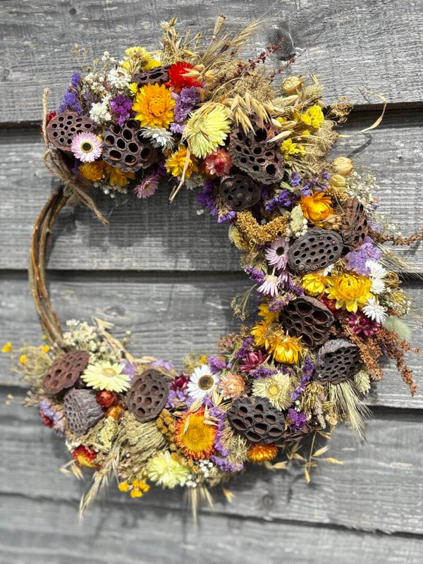 Iedere krans is hand gebonden met onze eigen gekweekte, duurzame, gifvrije droogbloemen en uniek.