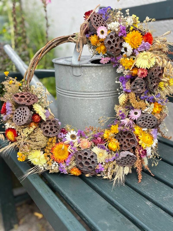 Een grote krans vol met de mooiste droogbloemen. Een echte eyecatcher aan je muur of deur. De krans is gebonden op een krans van wilgenhout. In de krans zijn naast lotus vruchten een tal van verschillende soorten droogbloemen en grassen verwerkt.