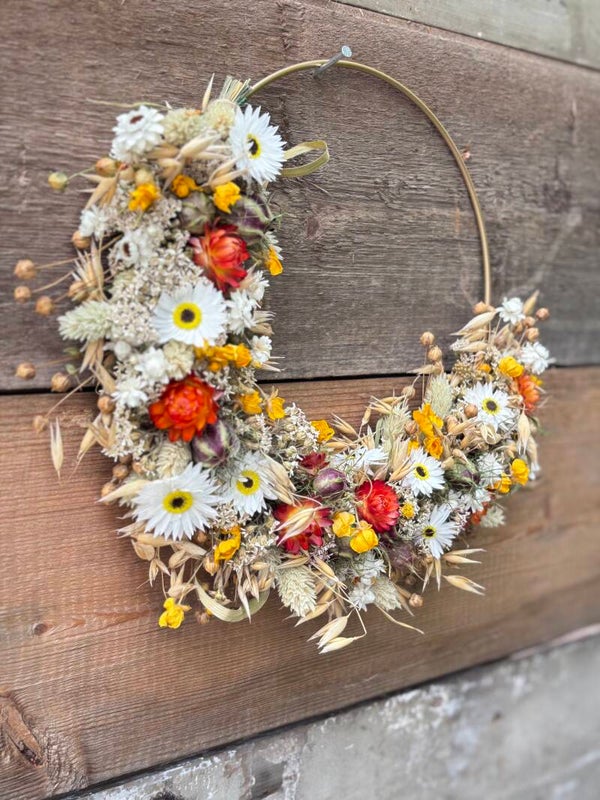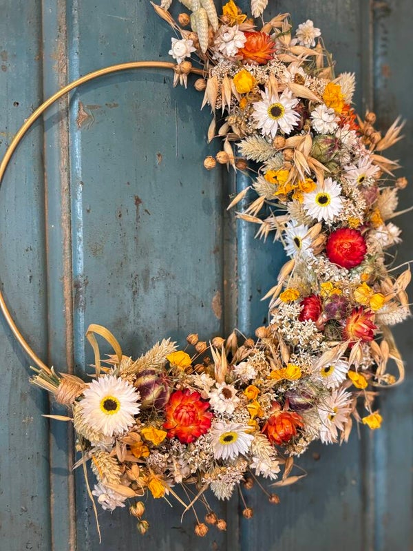 Iedere krans is hand gebonden met onze eigen gekweekte, duurzame, gifvrije droogbloemen en uniek.