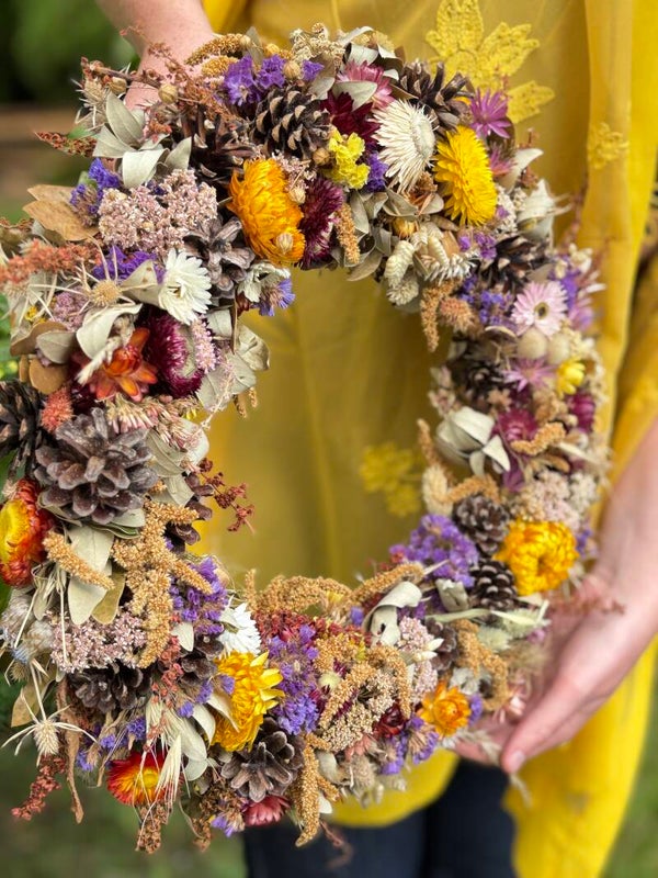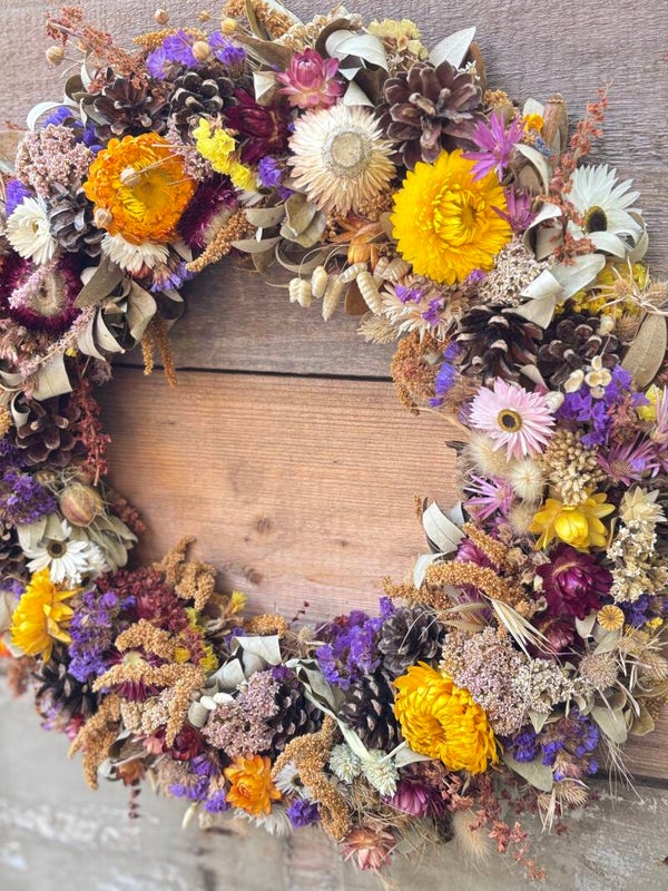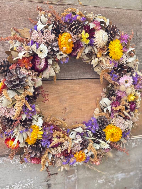 Iedere krans is hand gebonden met onze eigen gekweekte, duurzame, gifvrije droogbloemen en uniek.