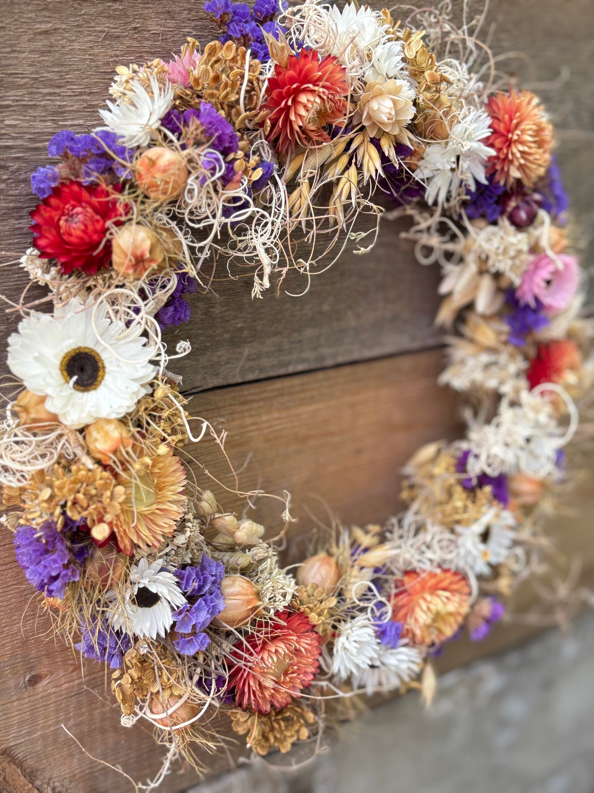 Iedere krans is hand gebonden met onze eigen gekweekte, duurzame, gifvrije droogbloemen en uniek.