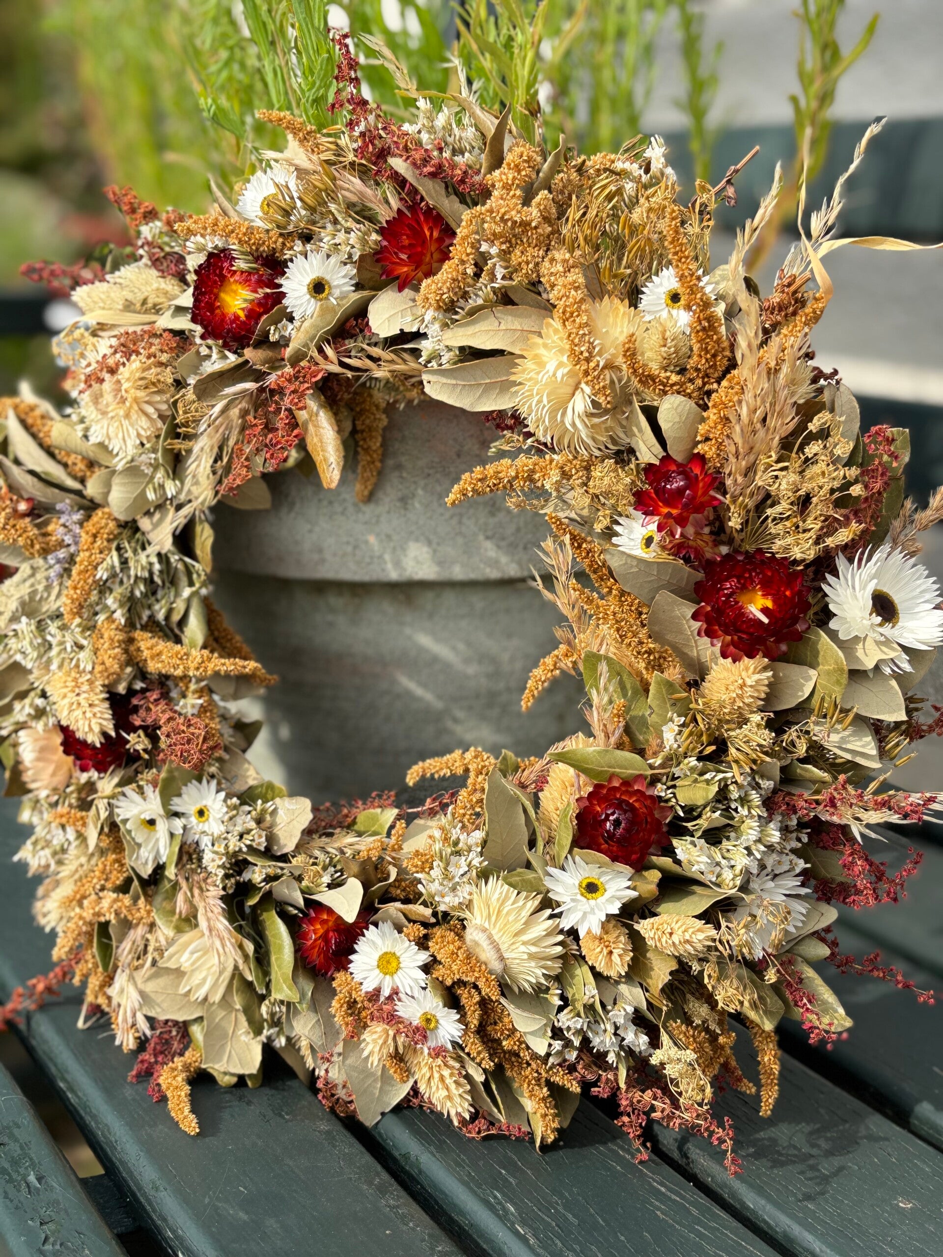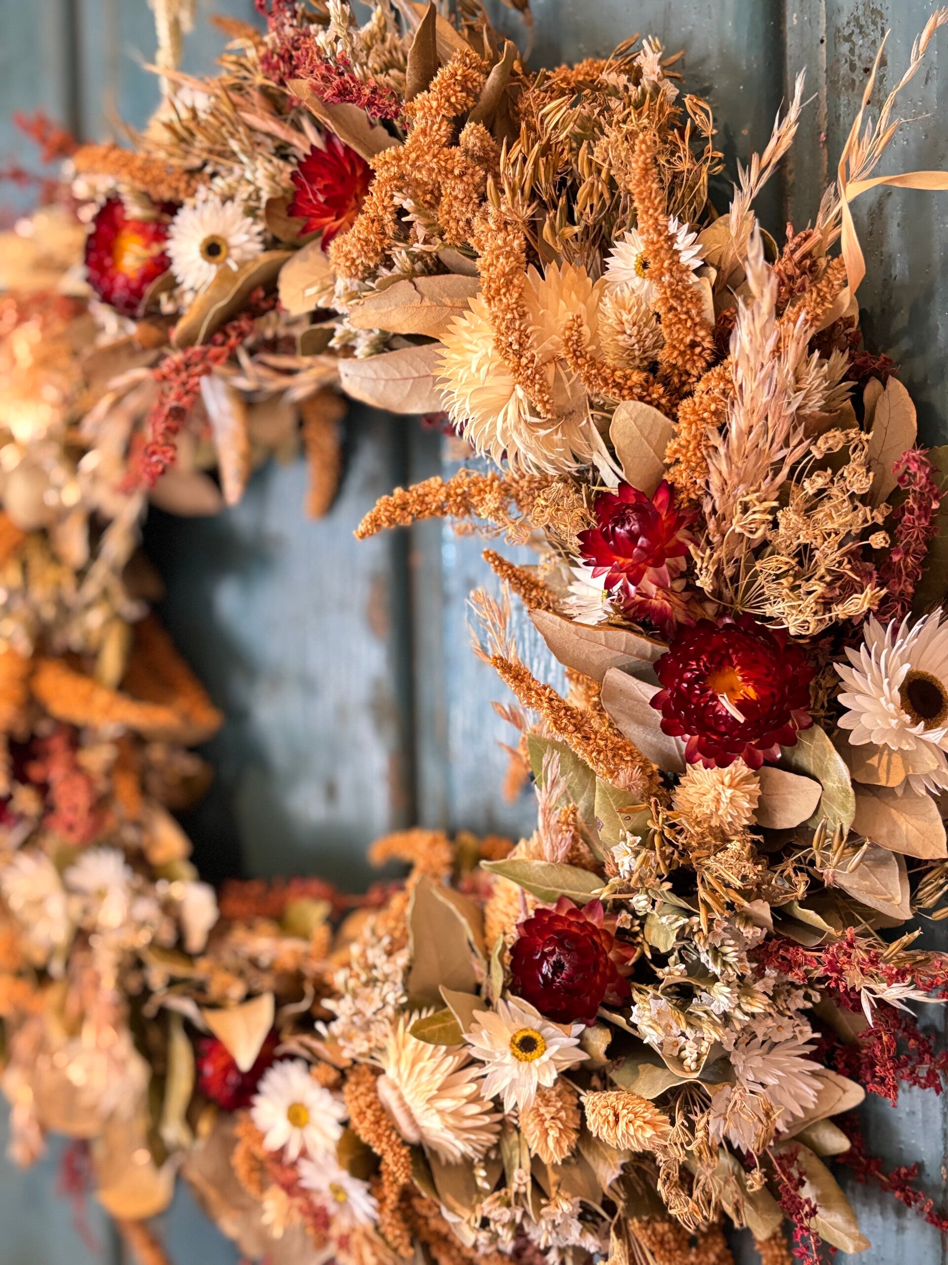 Iedere krans is hand gebonden met onze eigen gekweekte, duurzame, gifvrije droogbloemen en uniek.