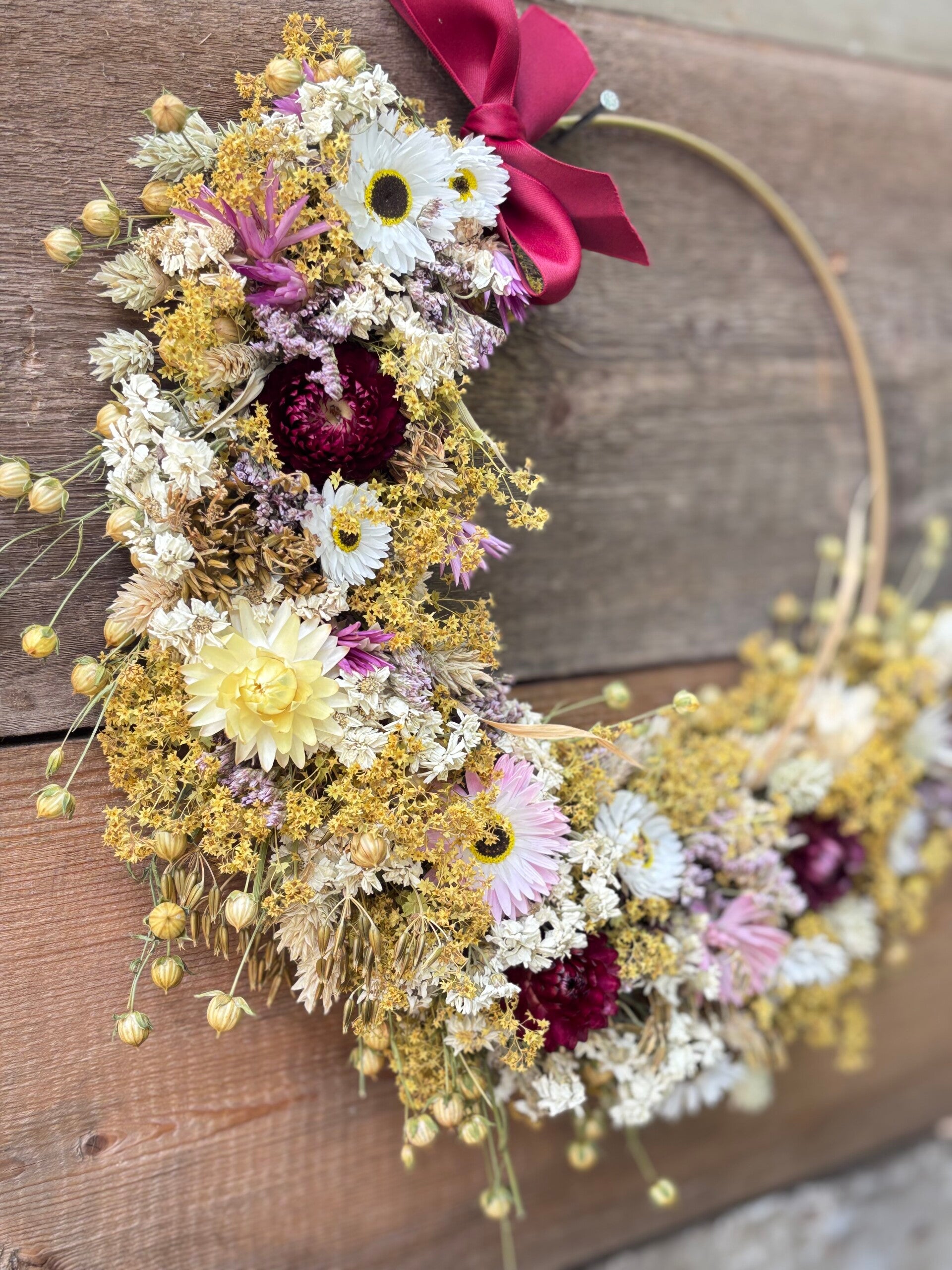 Iedere krans is hand gebonden met onze eigen gekweekte, duurzame, gifvrije droogbloemen en uniek.