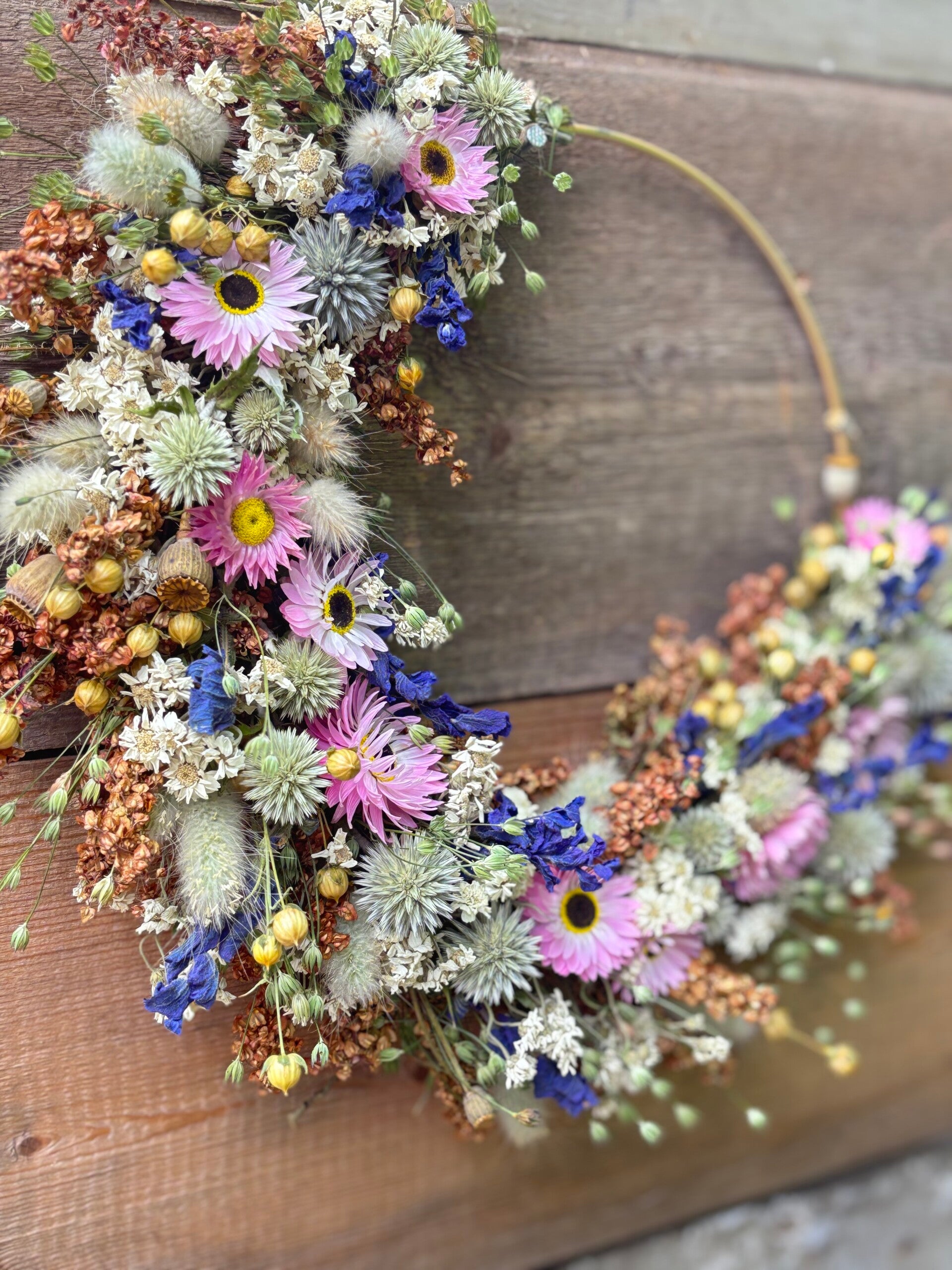 Een krans gebonden met allemaal verschillende soorten droogbloemen. Een prachtige mix van pastelkleuren op een goudkleurige ring.