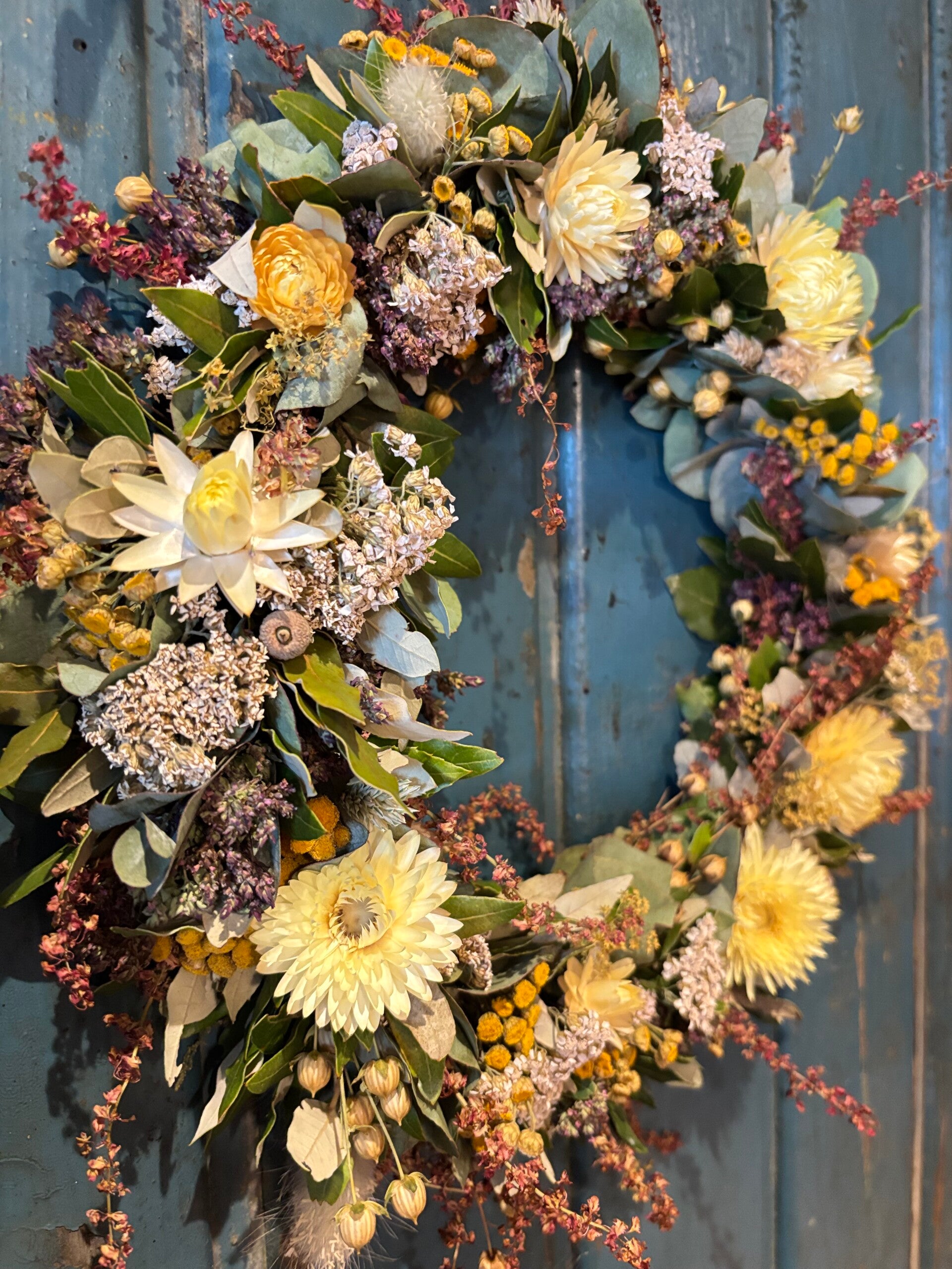 Iedere krans is hand gebonden met zoveel mogelijk onze eigen gekweekte droogbloemen en uniek.