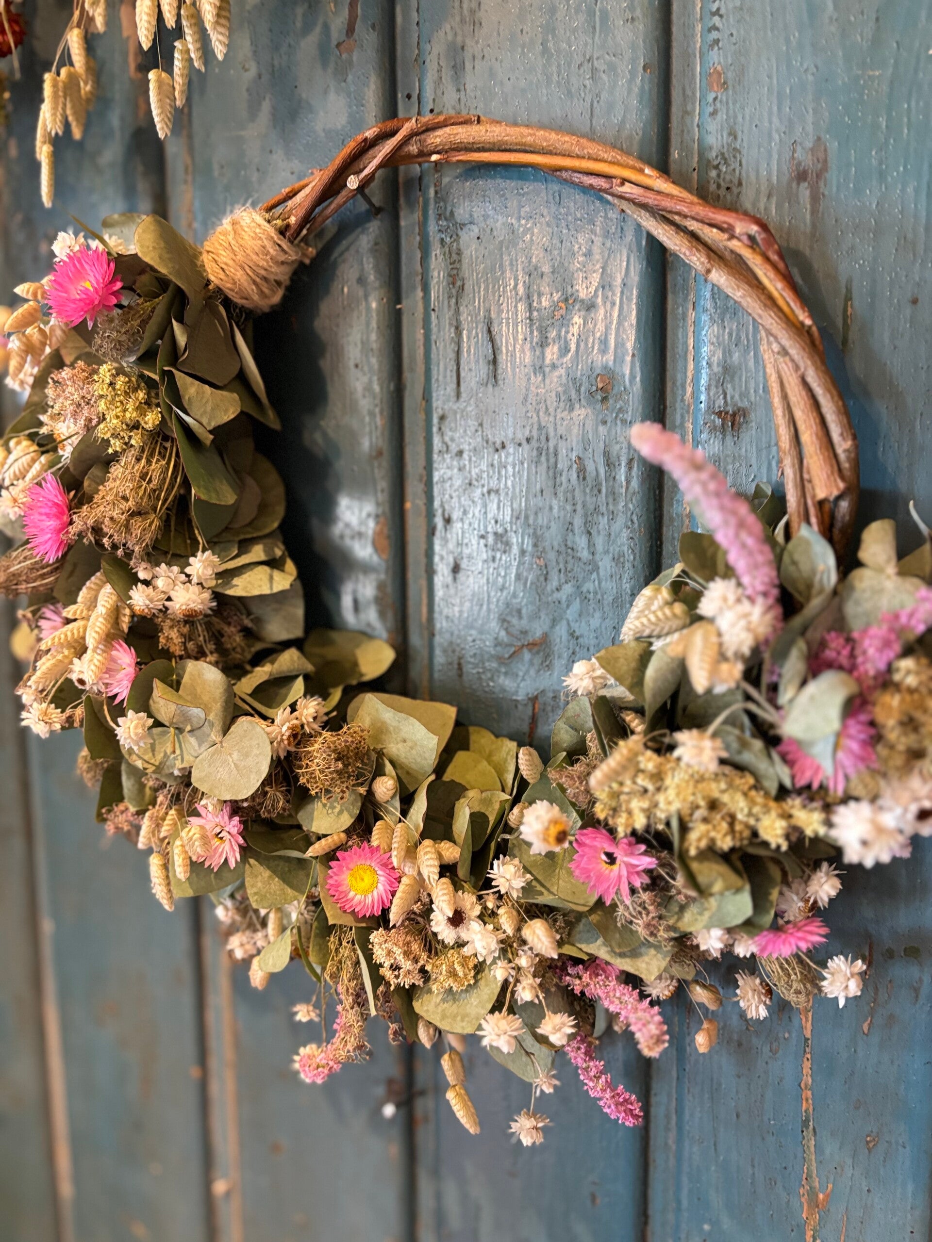 Een blikvanger deze krans. Het stoere van het hout van de wilg combineert heel mooi met het zachte van de roze en witte droogbloemen.