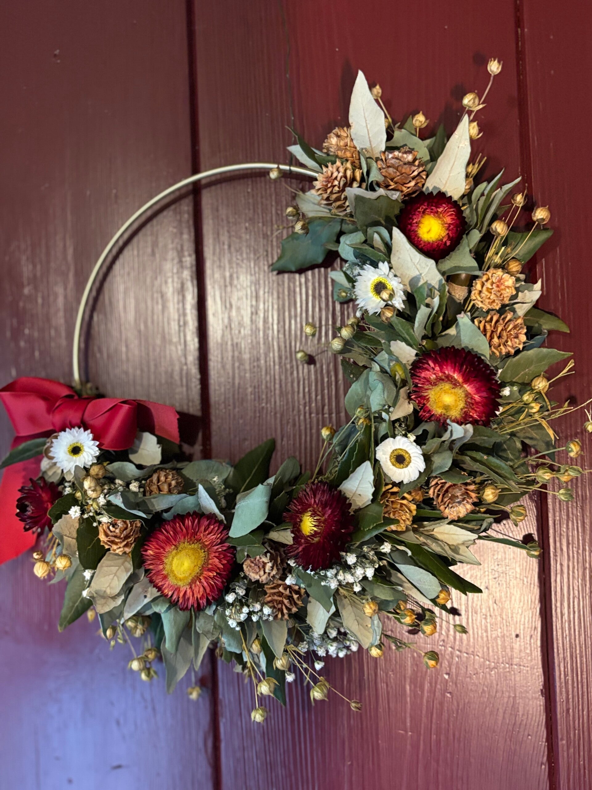 Dit lieve kerstkransje is gemaakt van verschillende soorten droogbloemen, eucalyptus en dennenappeltjes op een goudkleurige ring.