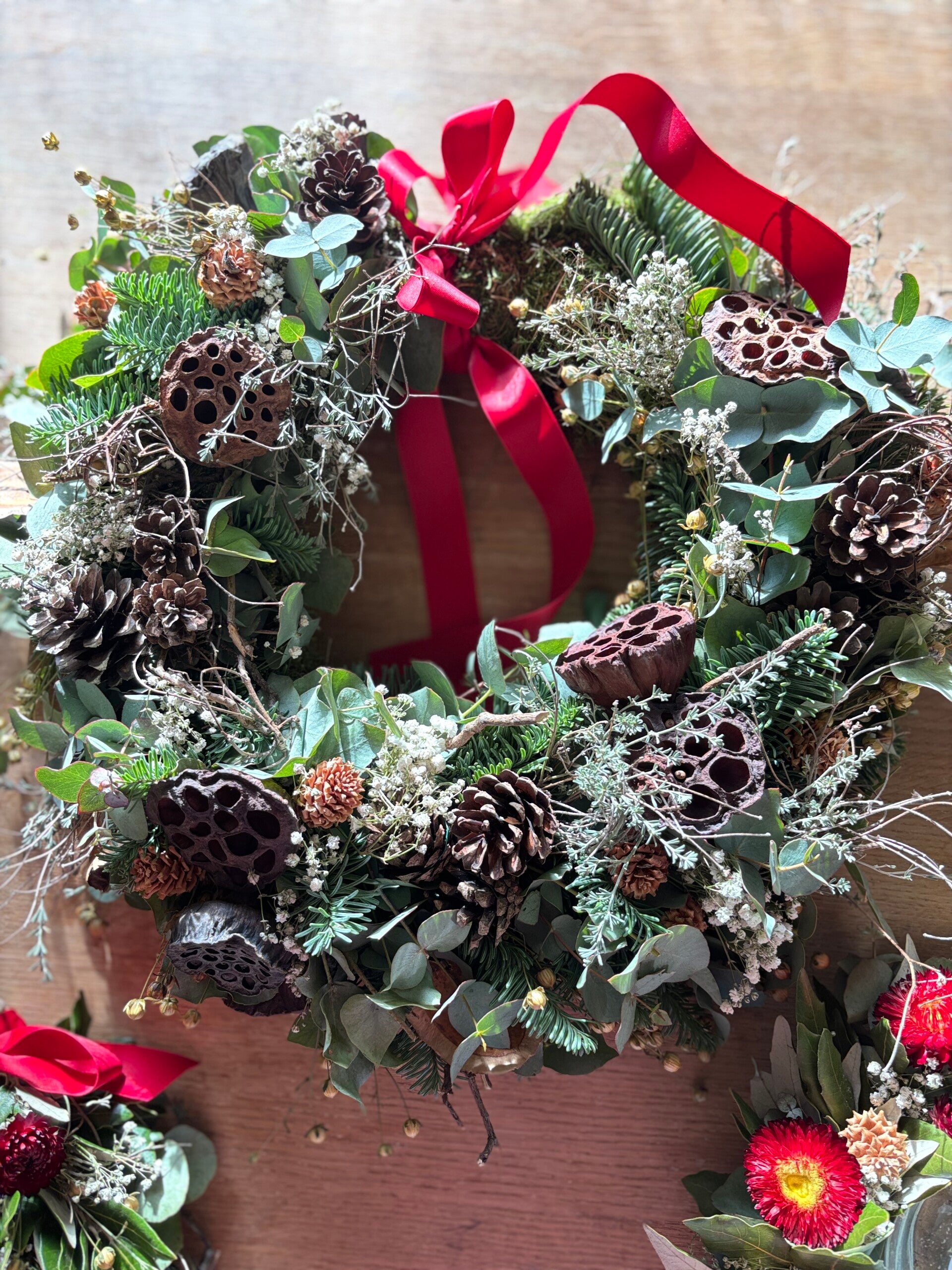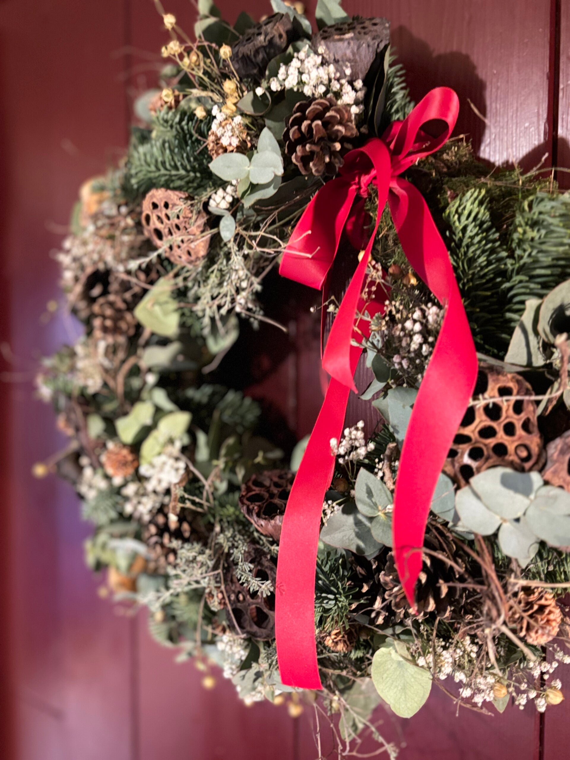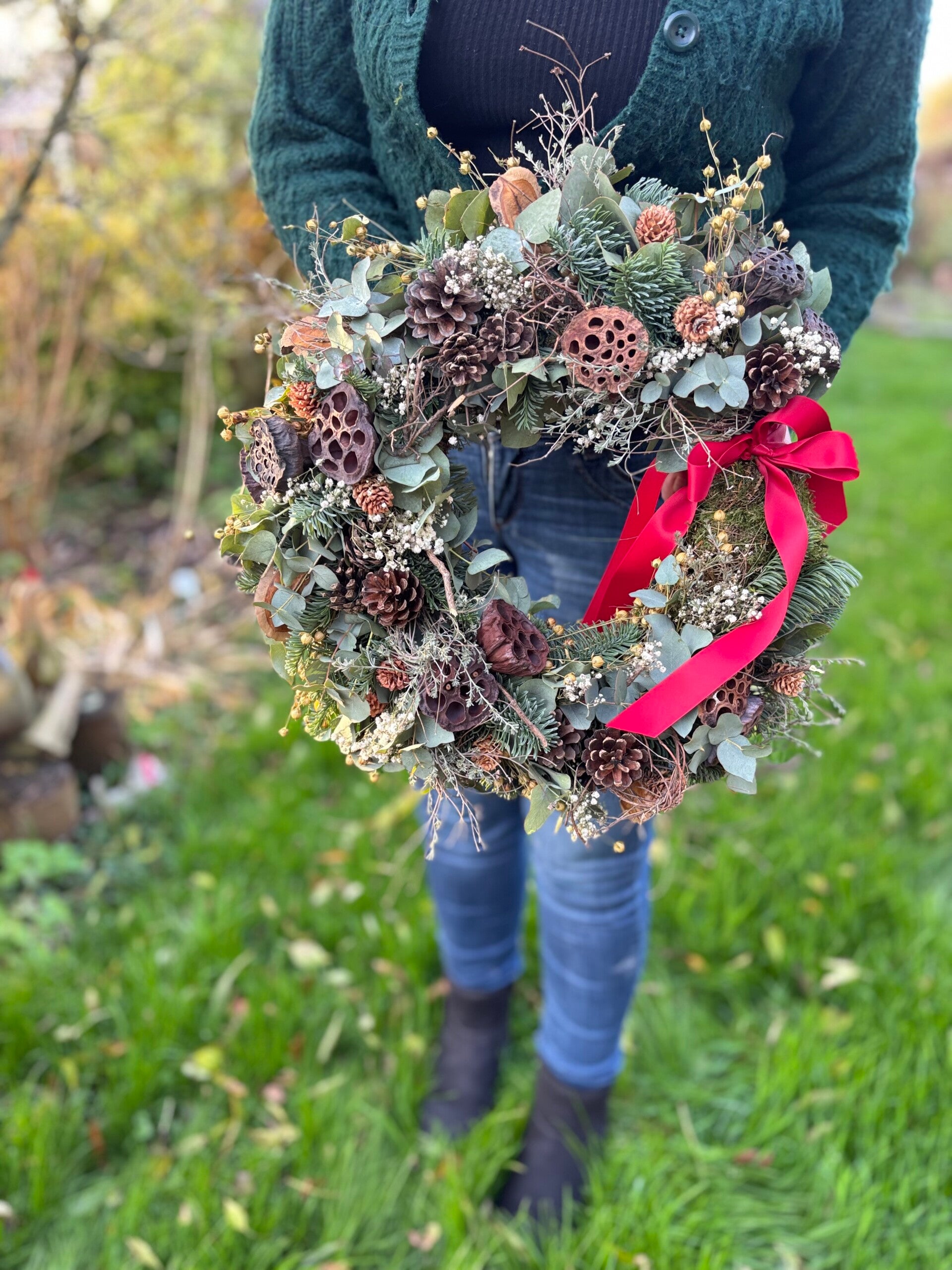 Iedere krans is hand gebonden. We werken zoveel mogelijk met onze eigen gekweekte, duurzame, gifvrije droogbloemen. Elke krans is uniek.