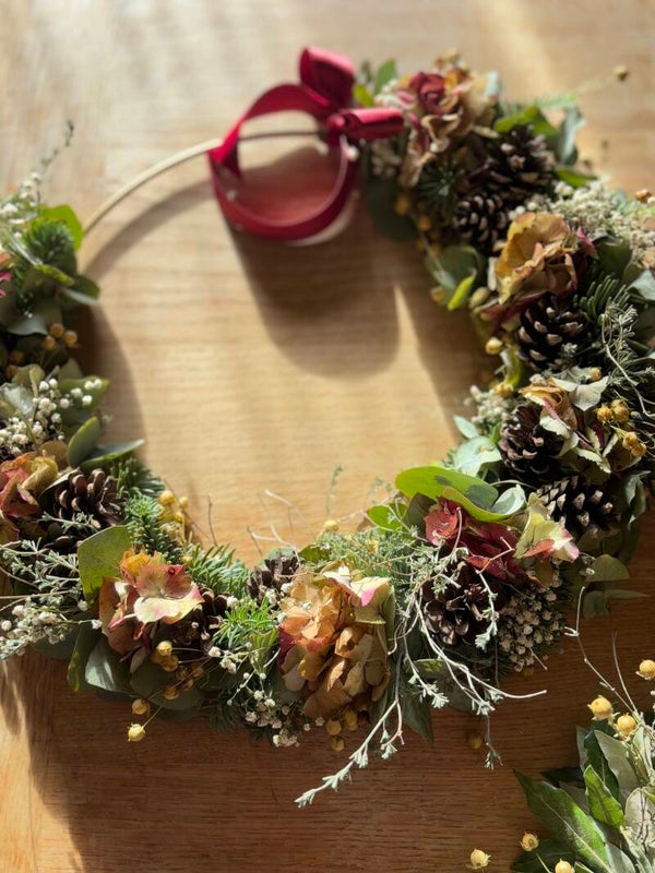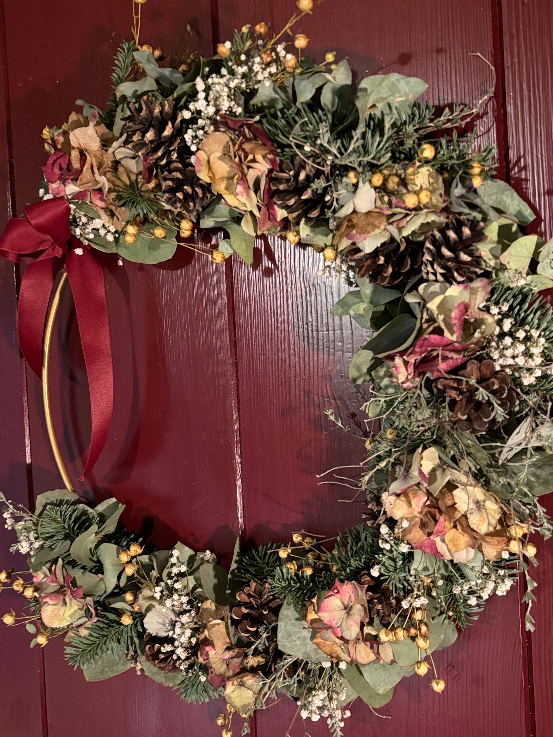Prachtige krans voor kerst met verschillende soorten blad en droogbloemen. De gedroogde bloemen van de hortensia geven deze krans een pastelkleurige gloed.