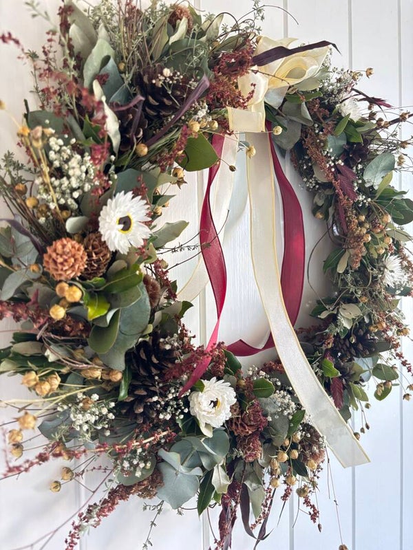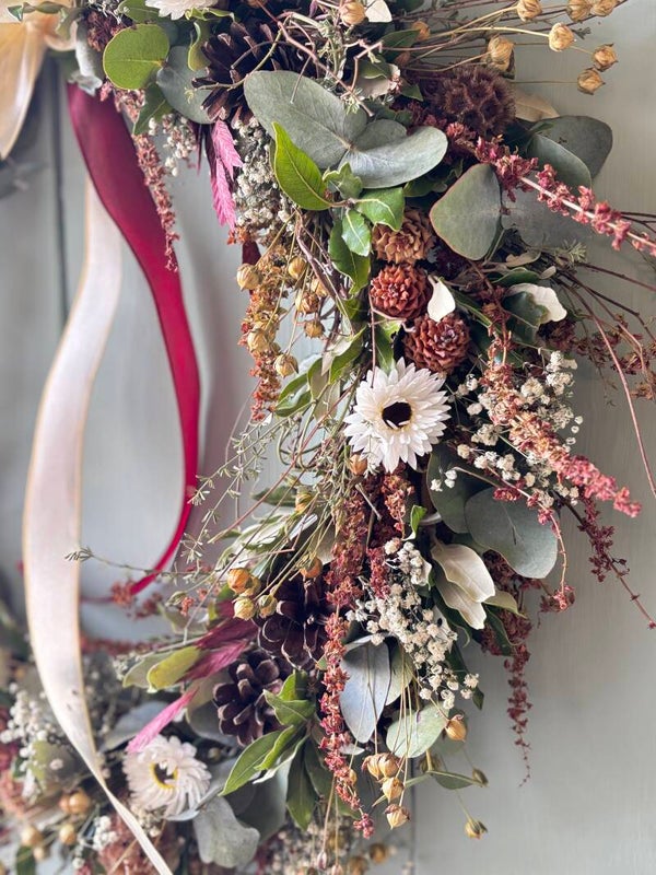 Iedere krans is hand gebonden. We werken zoveel mogelijk met onze eigen gekweekte, duurzame, gifvrije droogbloemen. Elke krans is uniek.