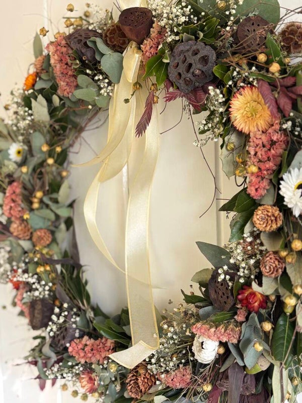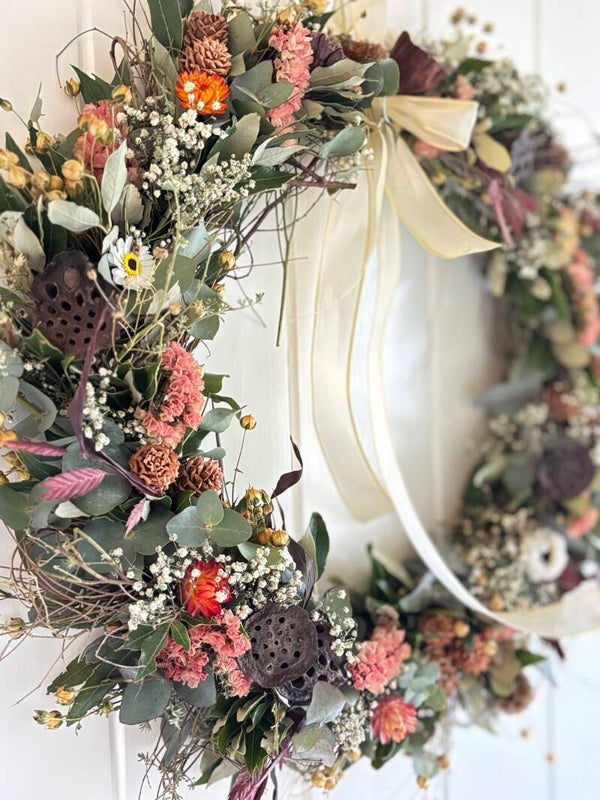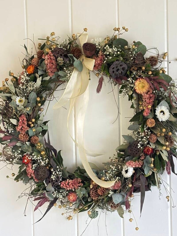 Iedere krans is hand gebonden. We werken zoveel mogelijk met onze eigen gekweekte, duurzame, gifvrije droogbloemen. Elke krans is uniek.