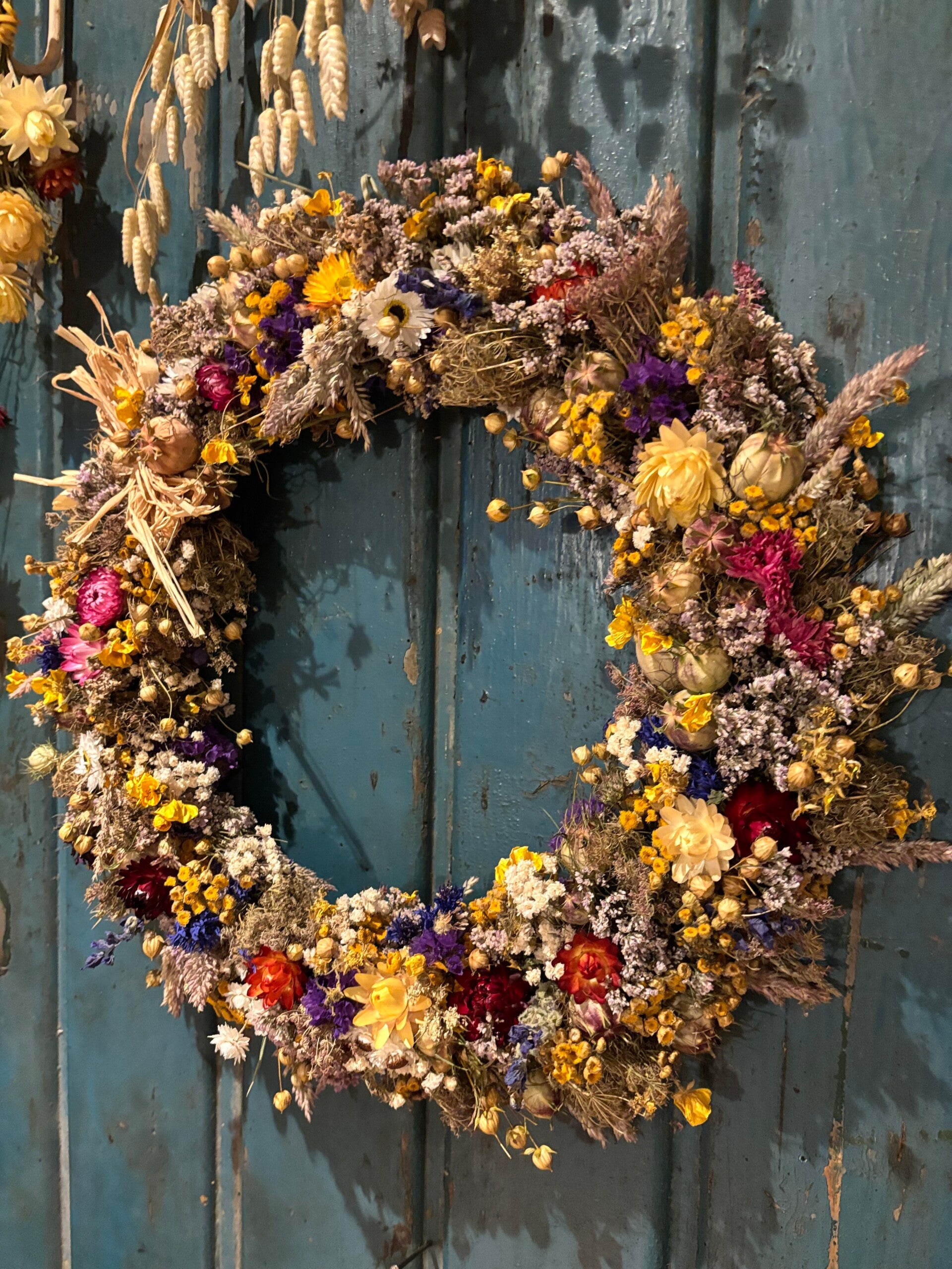 Iedere krans is hand gebonden met onze eigen gekweekte droogbloemen en uniek.