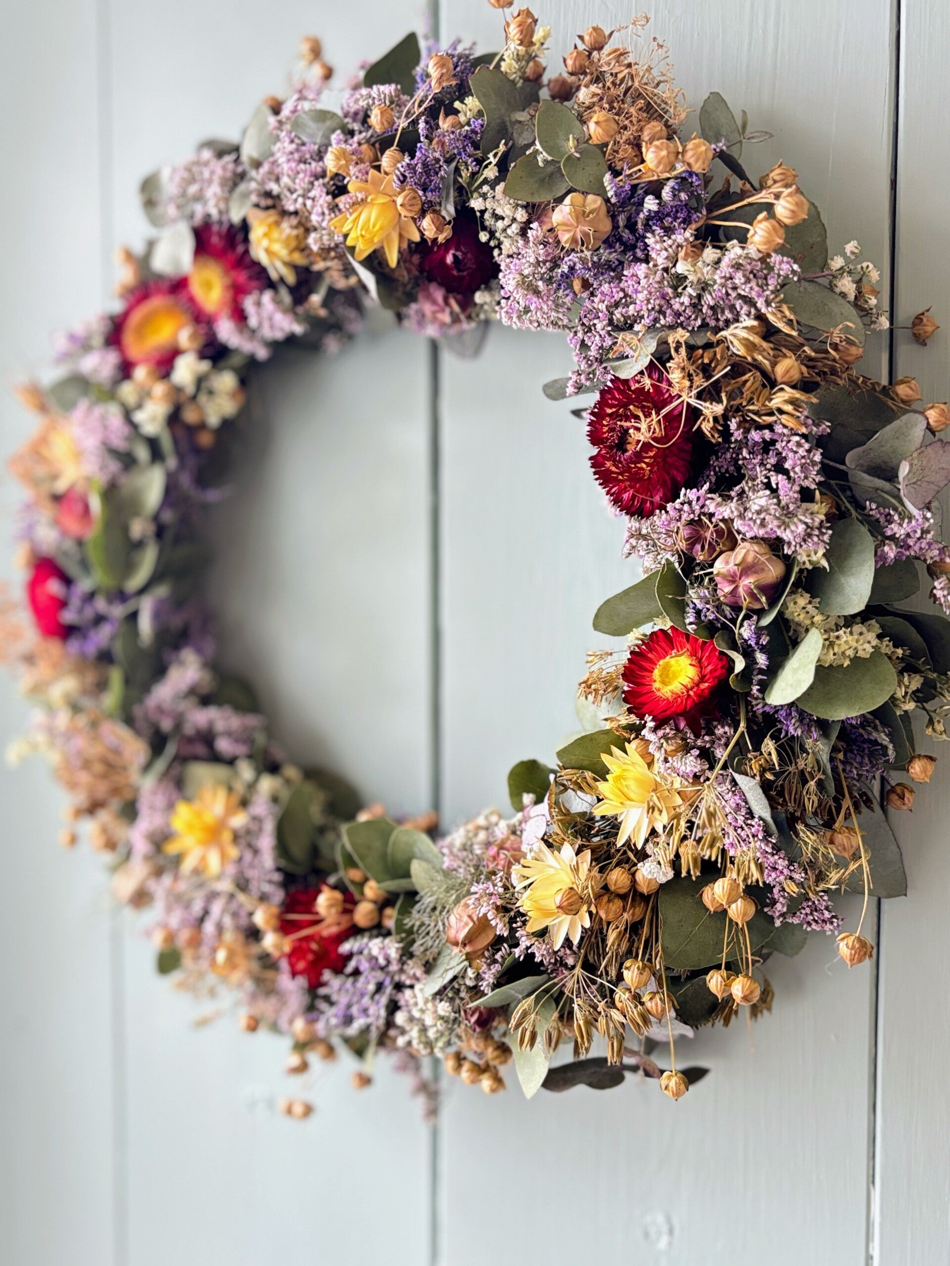 Eucalyptus krans met kleurrijke droogbloemen