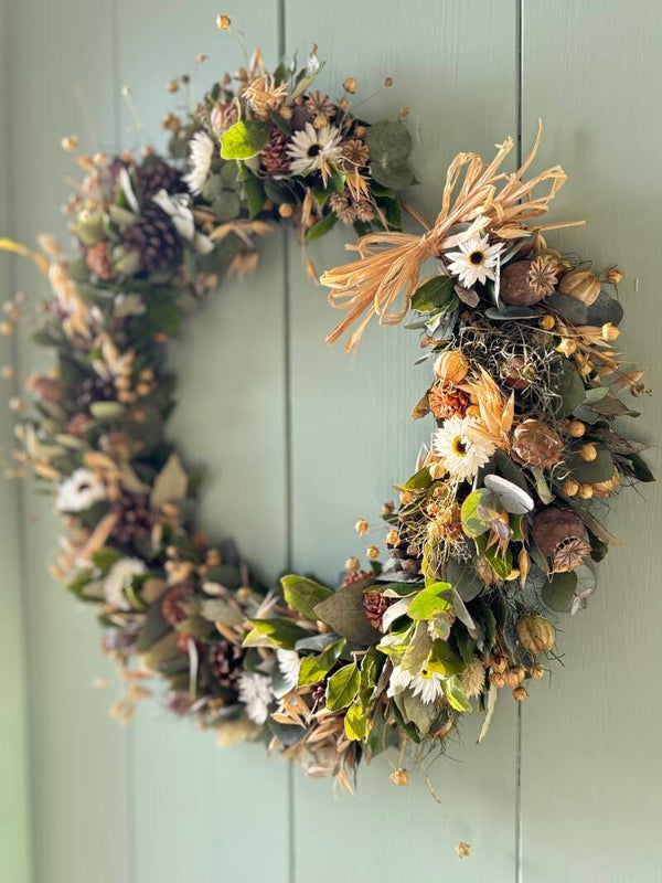 Iedere krans is hand gebonden met zoveel mogelijk onze eigen gekweekte droogbloemen en uniek.