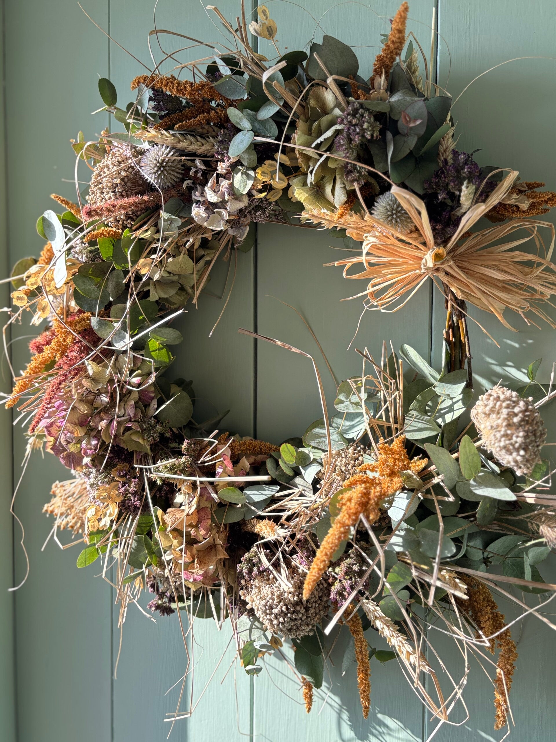 Iedere krans is hand gebonden met zoveel mogelijk onze eigen gekweekte droogbloemen en uniek.