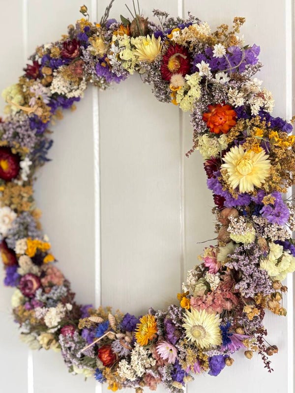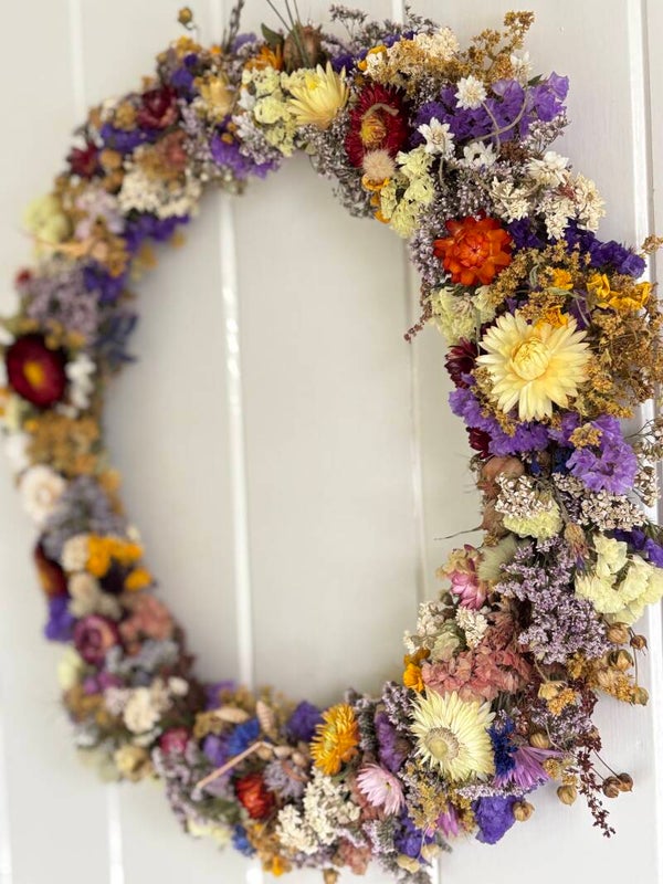 Iedere krans is hand gebonden met zoveel mogelijk onze eigen gekweekte droogbloemen en uniek.