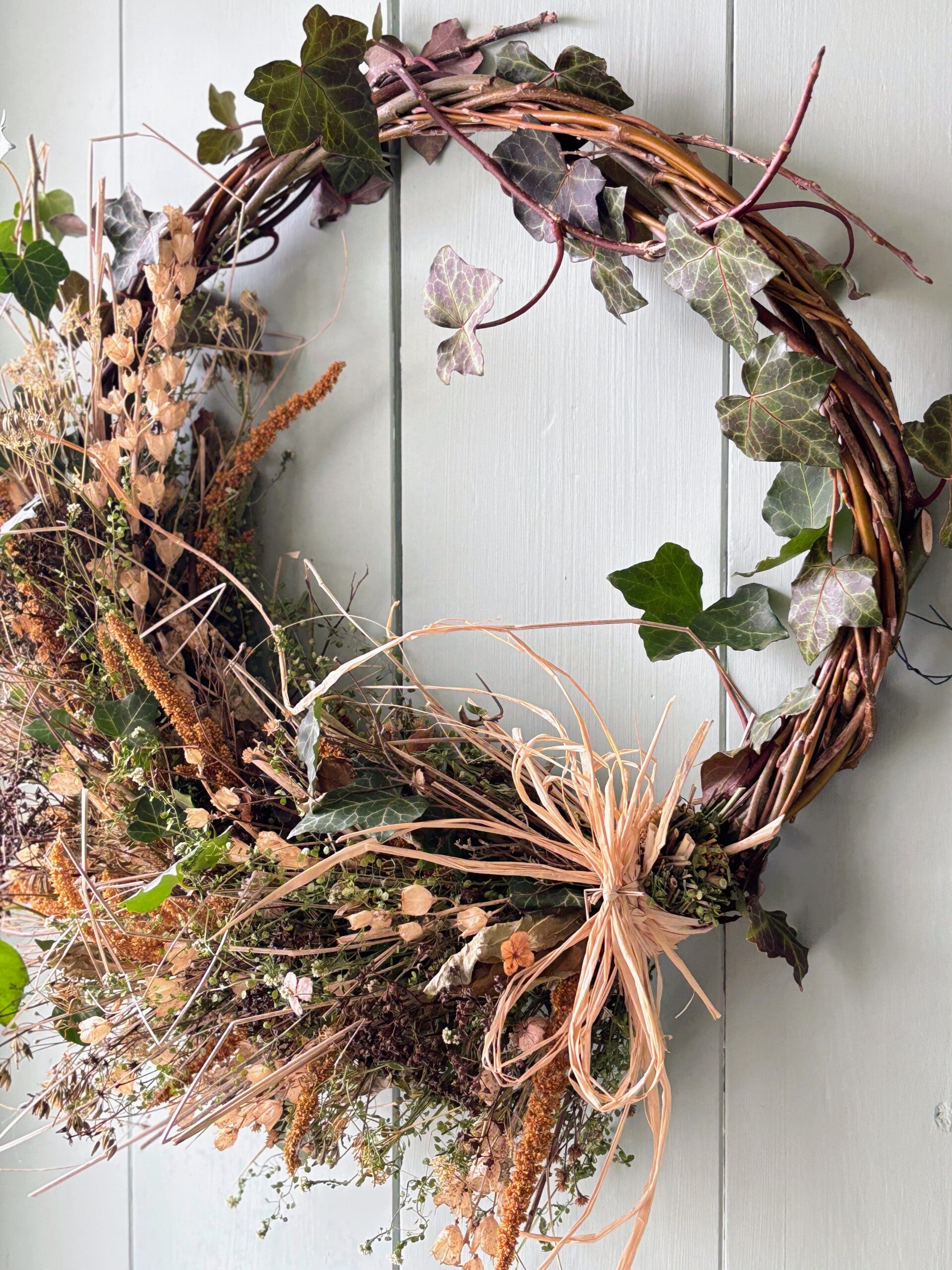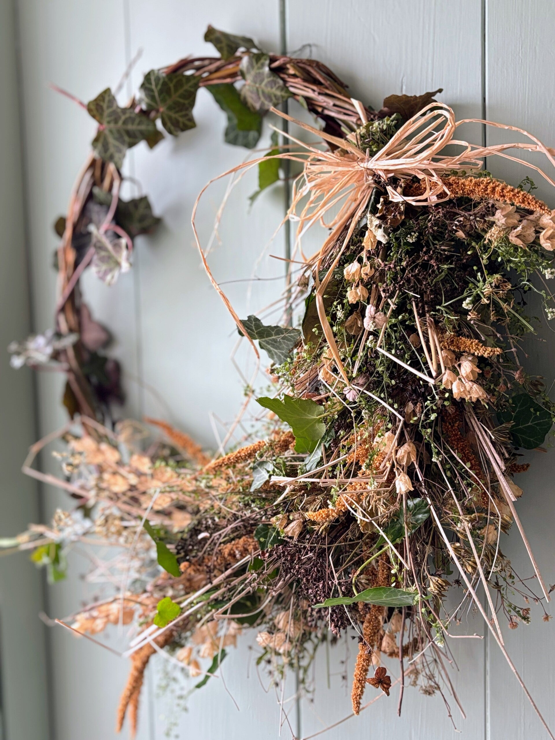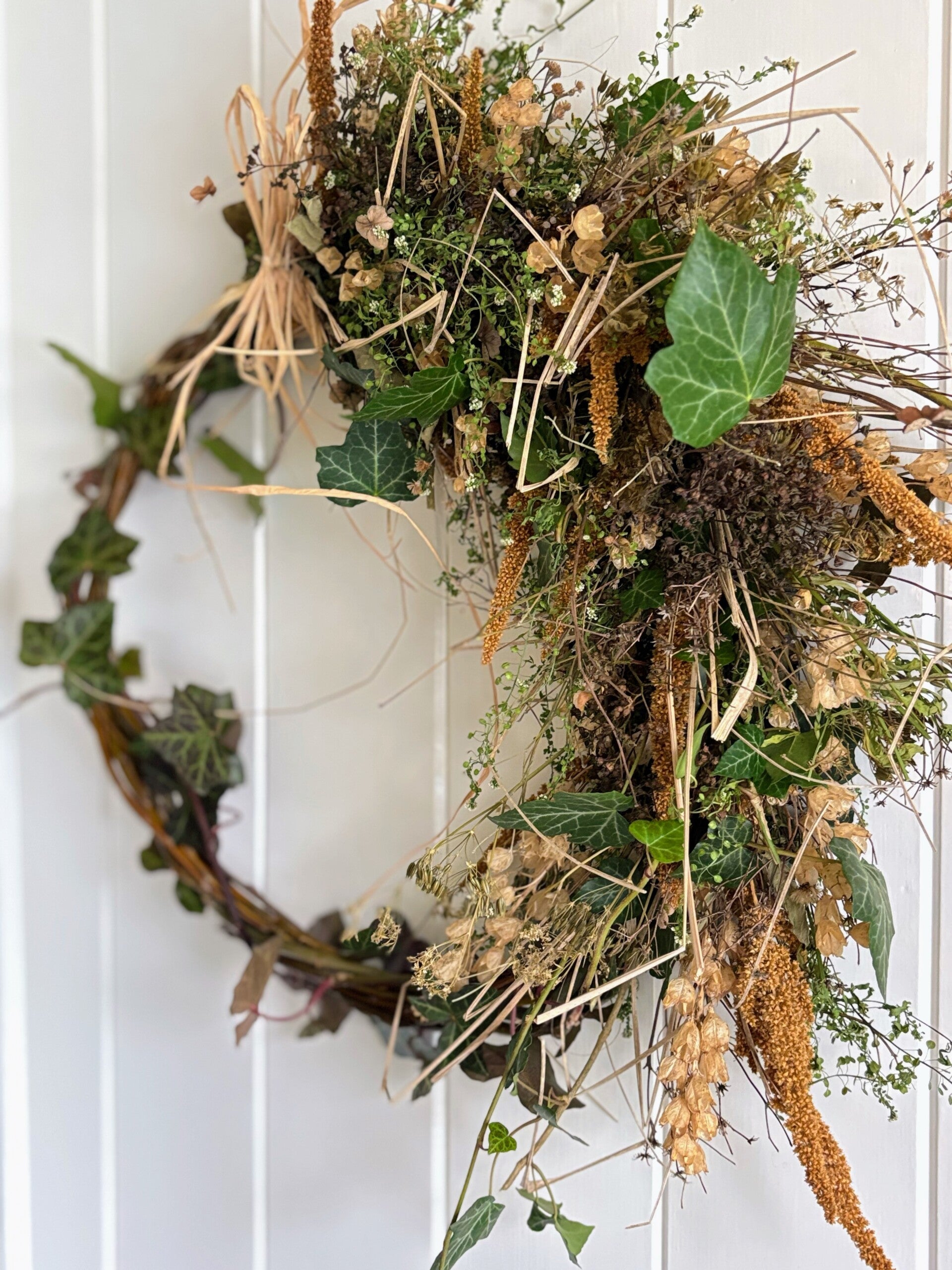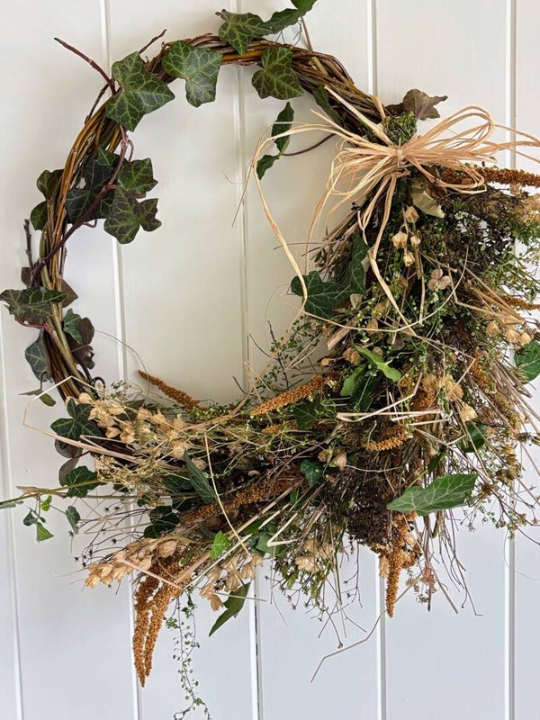 Iedere krans is hand gebonden met zoveel mogelijk onze eigen gekweekte droogbloemen en uniek.