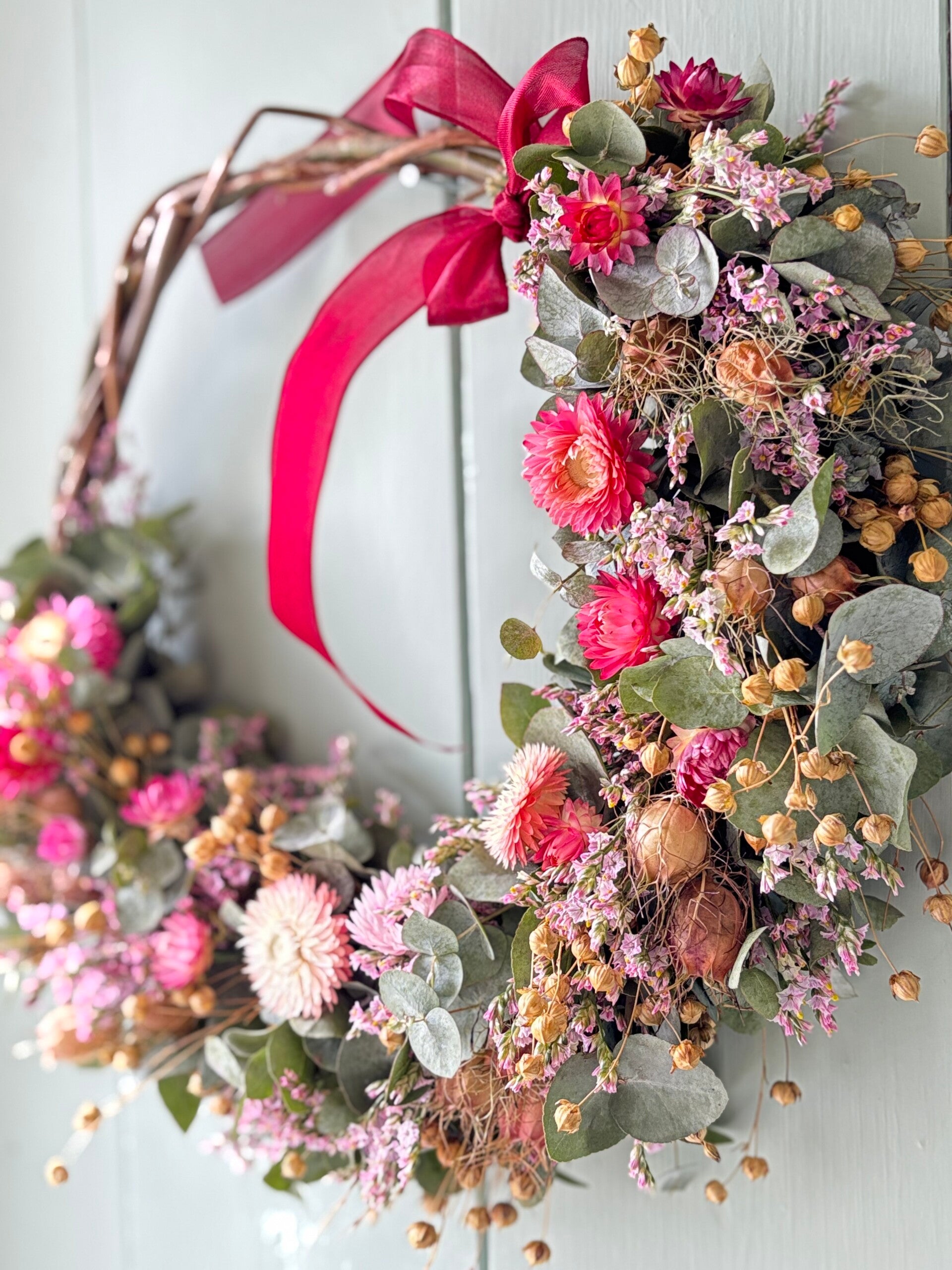 Kijk nou hoe leuk! Zulke prachtige roze strobloemen. Gecombineerd met vlas, eucalyptus en lieve kleine roze droogbloemetjes. Een echte eyecatcher deze krans.
