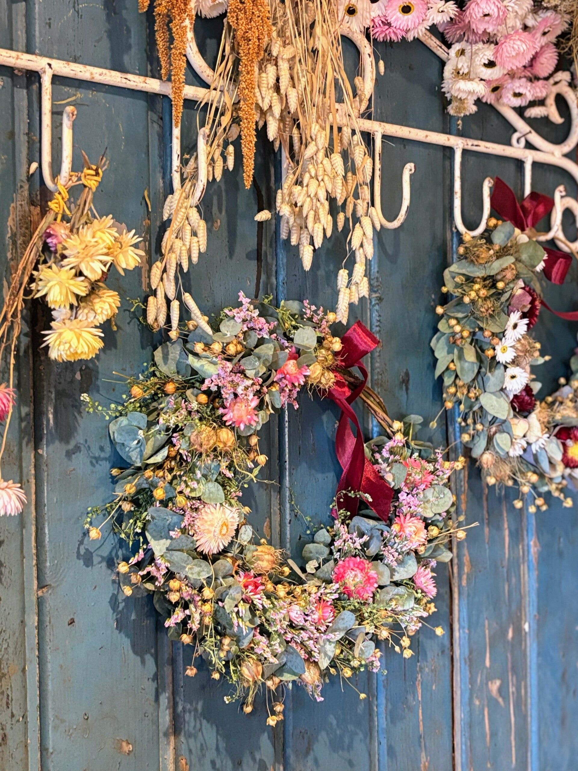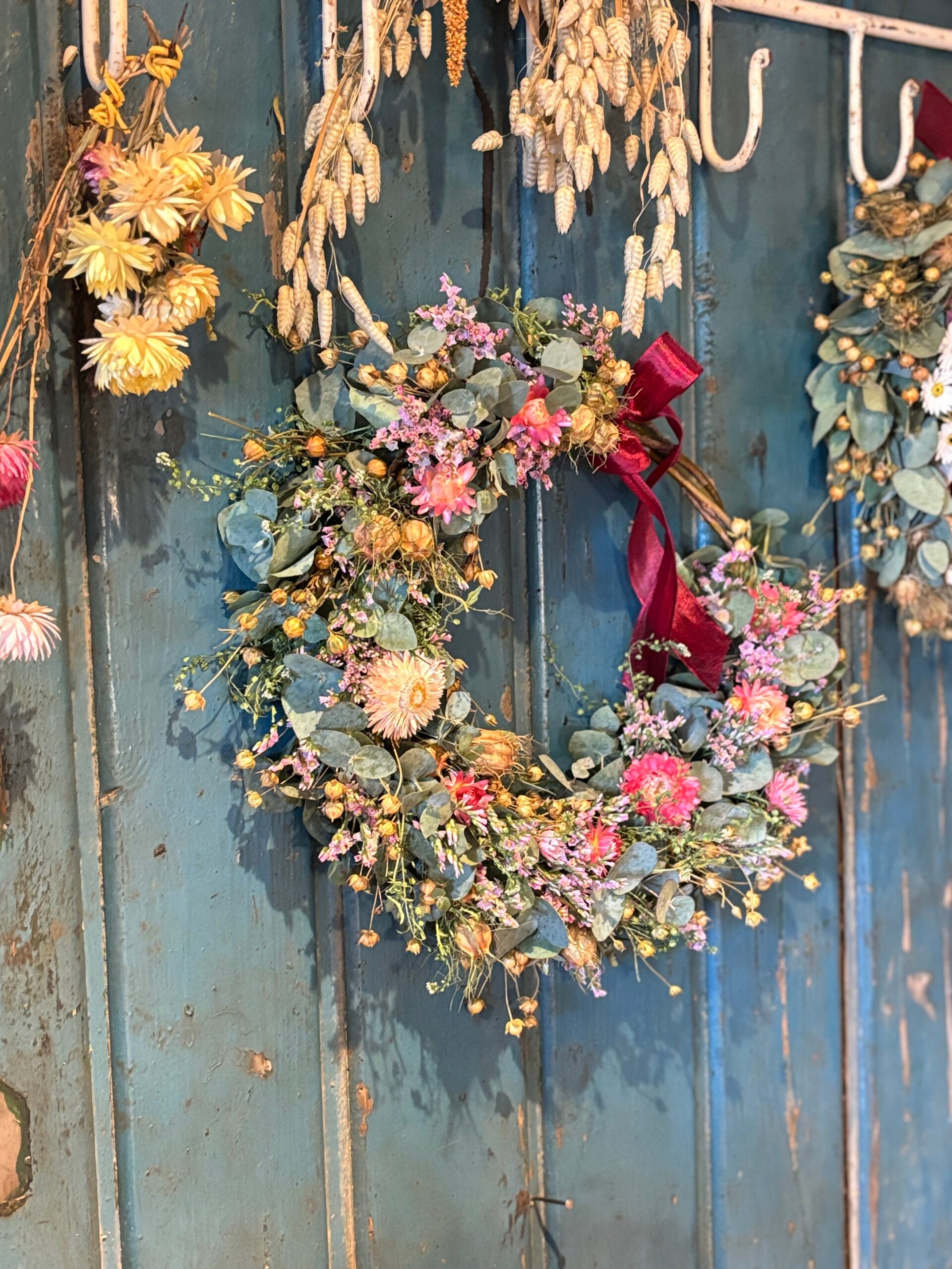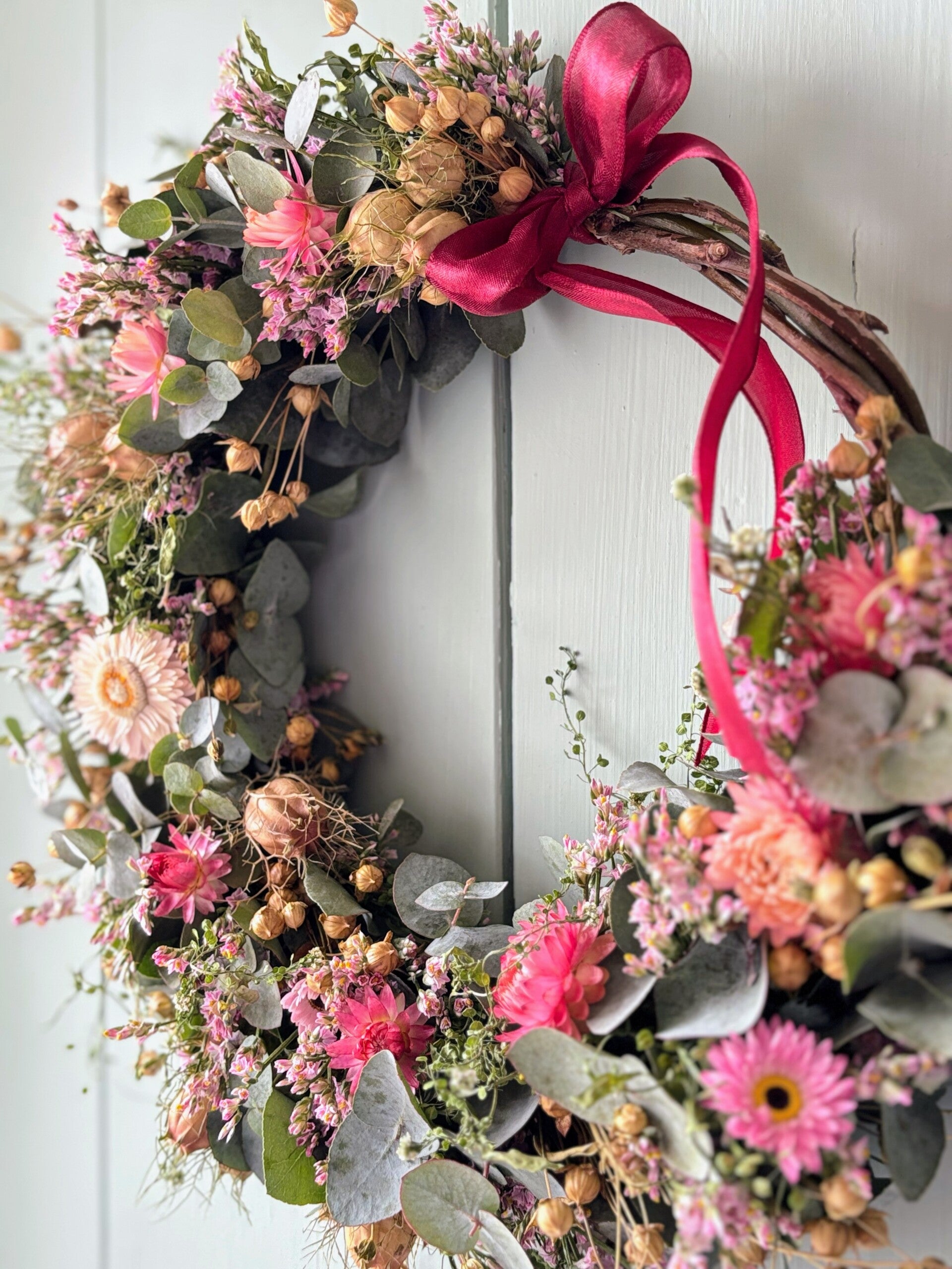 Een romantische kransje met eucalyptus en roze droogbloemen. Vlasbolletjes maken het geheel helemaal af 🤍