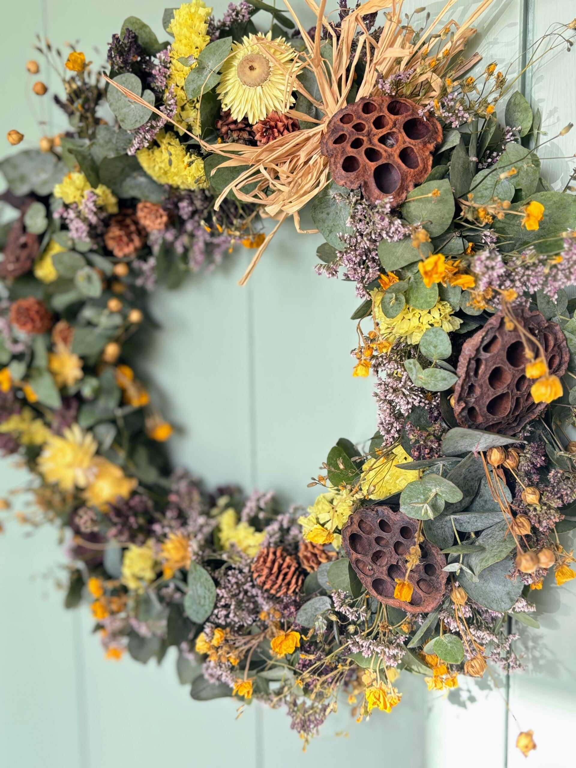 Zacht gele strobloem, warm gele boterbloemen en een vleugje lila combineren heel mooi met het eucalyptus blad. De mooie grote lotussen geven een mooi stoer contrast.