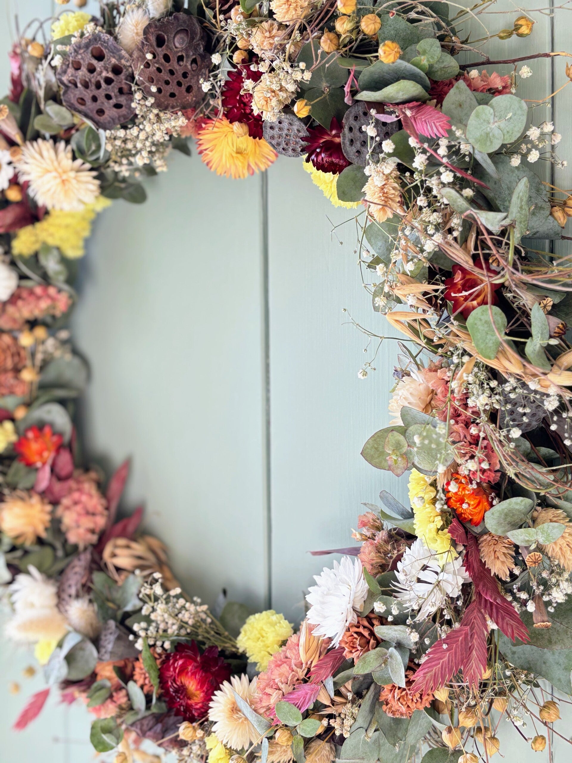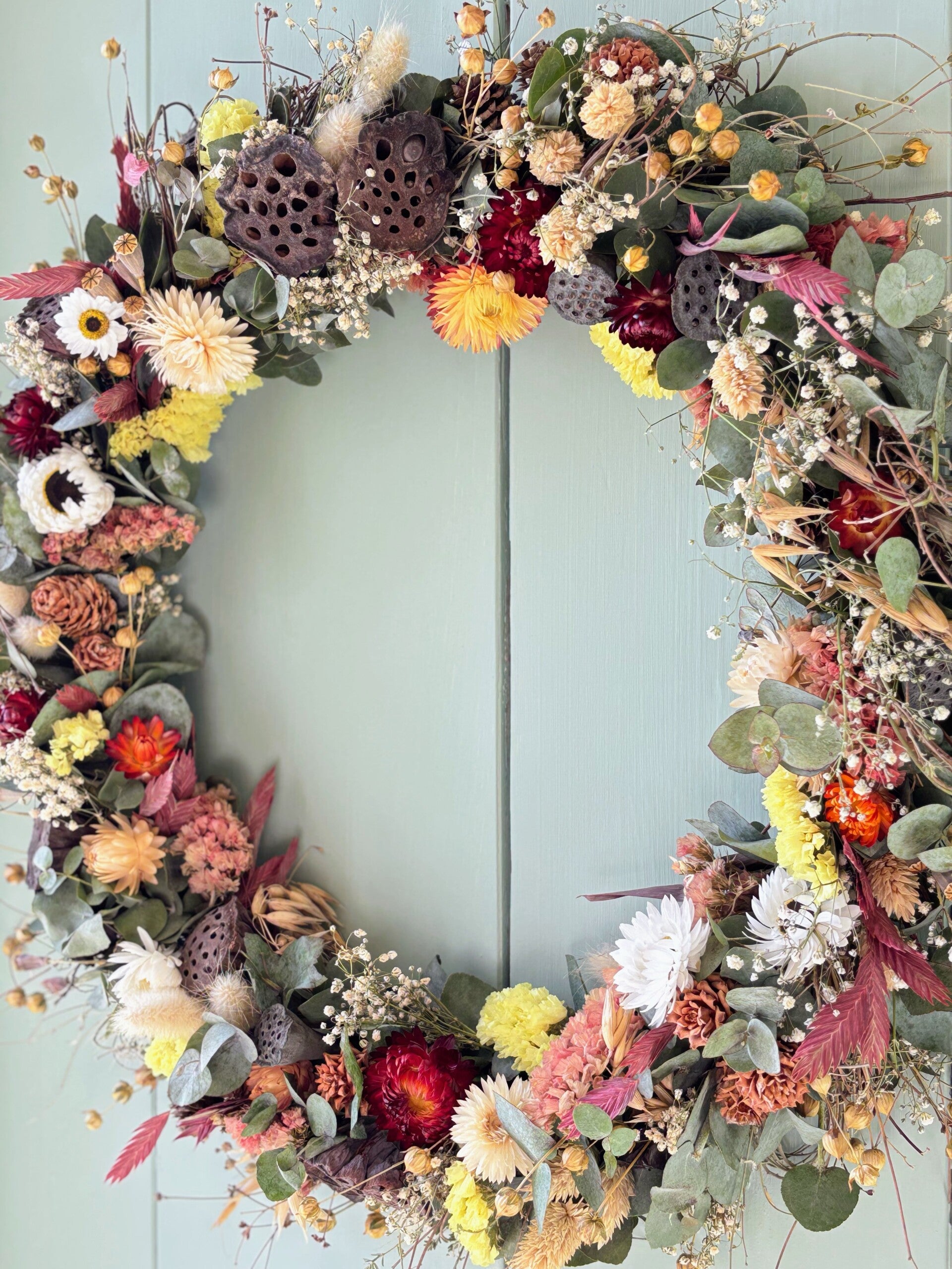 De krans is samengesteld uit een rijke mix van natuurlijke droogbloemen in warme tinten zoals dieprood, zachtgeel, crème en groen. Eucalyptus, fijne structuurbloemen en decoratieve elementen zoals lotuszaaddozen zorgen voor een speels en stijlvol geheel met een subtiele, rustieke touch.