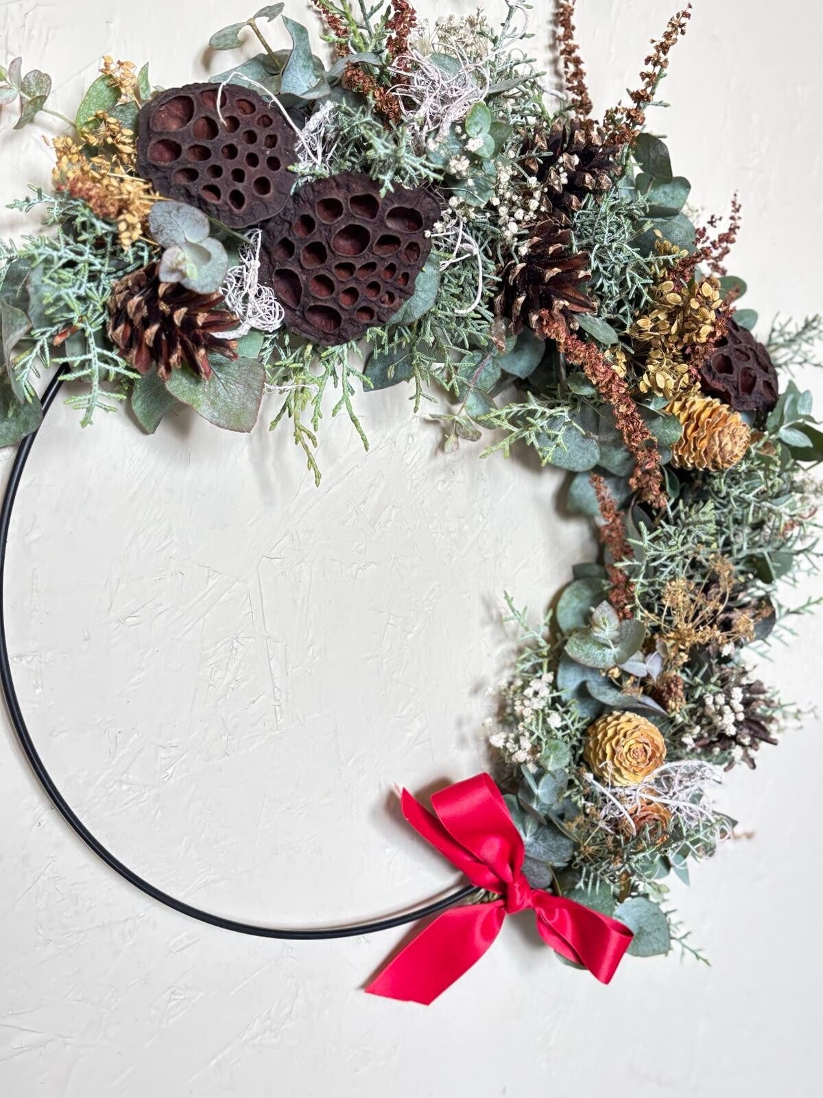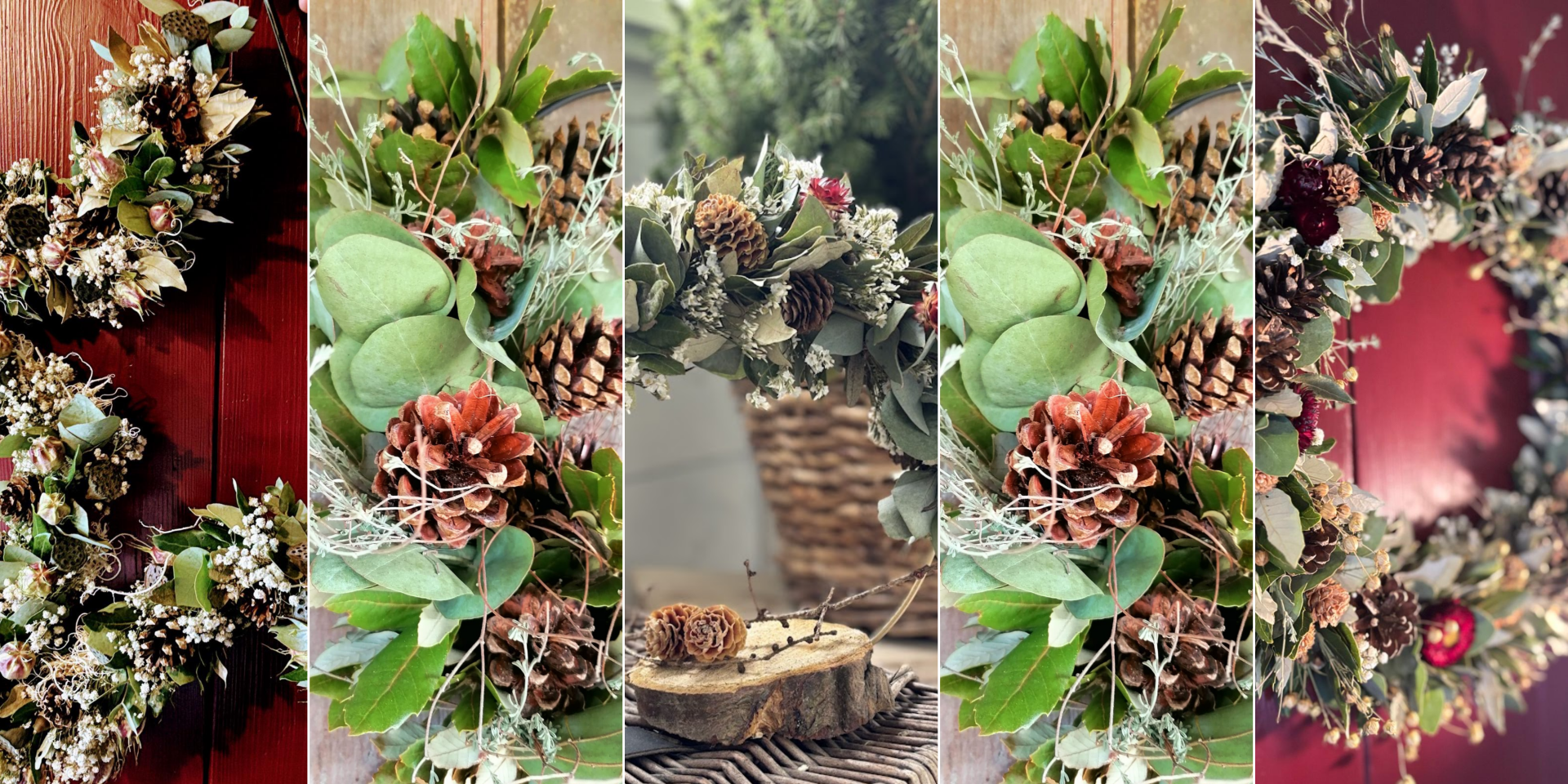 Wij werken graag zo duurzaam mogelijk. Dat zie je terug in onze materiaalkeuze. We kiezen ervoor om met materialen te werken die mooi indrogen. Zoals eucalyptus, steeneik en gedroogde vruchten. Je hoeft je creatie na de kerstdagen dus niet weg te gooien, maar kan er nog lang van genieten.